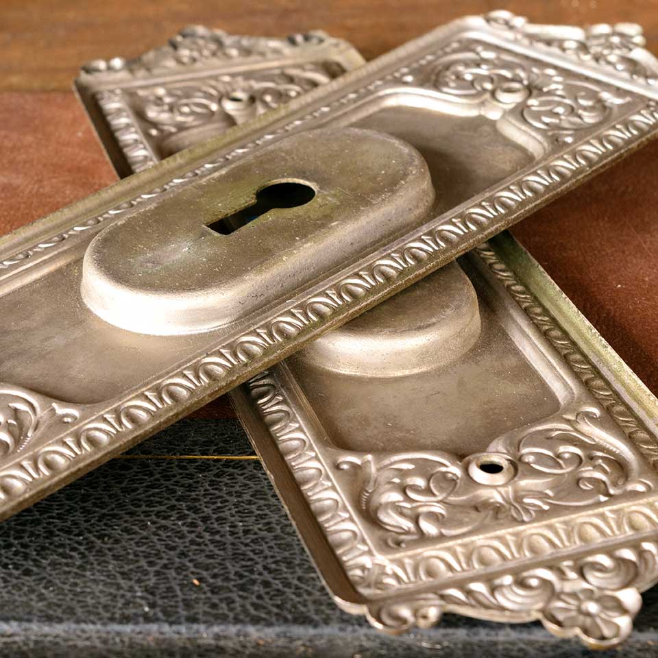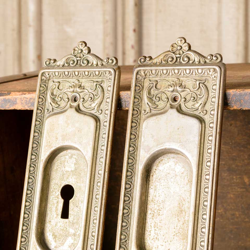 Set of two architectural salvage antique nickel-plated brass Corbin Mantua pattern (c. 1905) pocket door hardware pull handles (one with a keyhole & one without) each measuring approx. 2 5/8" wide x 8 3/4" tall x 1/4" front to back and a recessed area of 1 /3/8" x 3". See photos to evaluate condition. Priced at $175 for the two piece set.