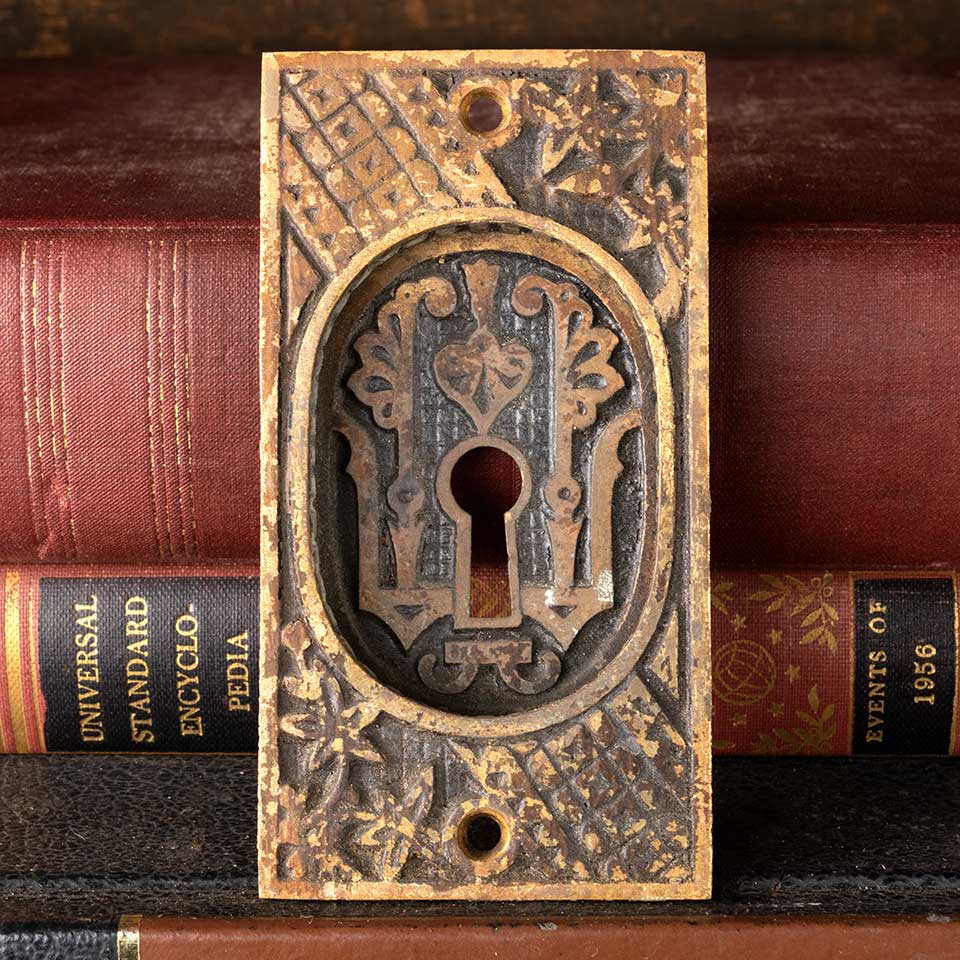 Architectural salvage antique ornate Victorian cast iron single pocket door pull handle hardware with a keyhole and Eastlake patterns measuring approx. 2 1/8" wide x 4 1/8" tall x 1/2" front to back with a recessed area 1 3/4" wide x 2 1/2" tall. See photos to evaluate condition.