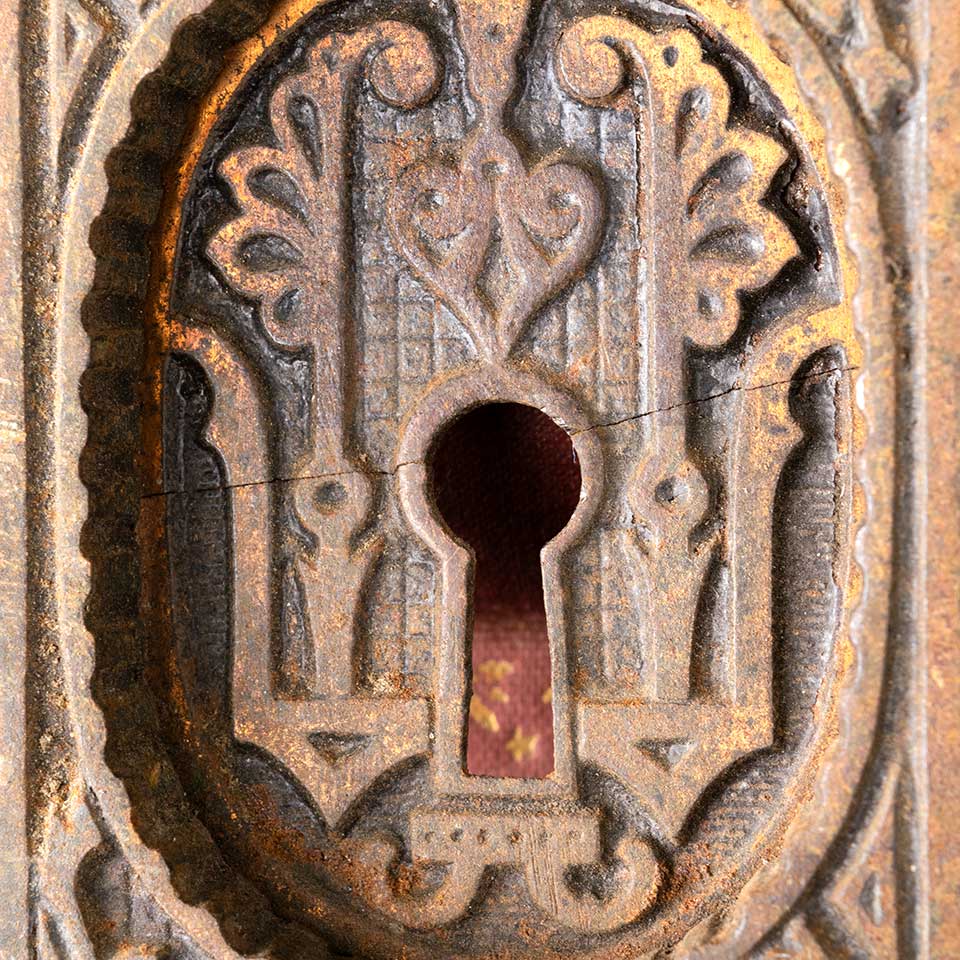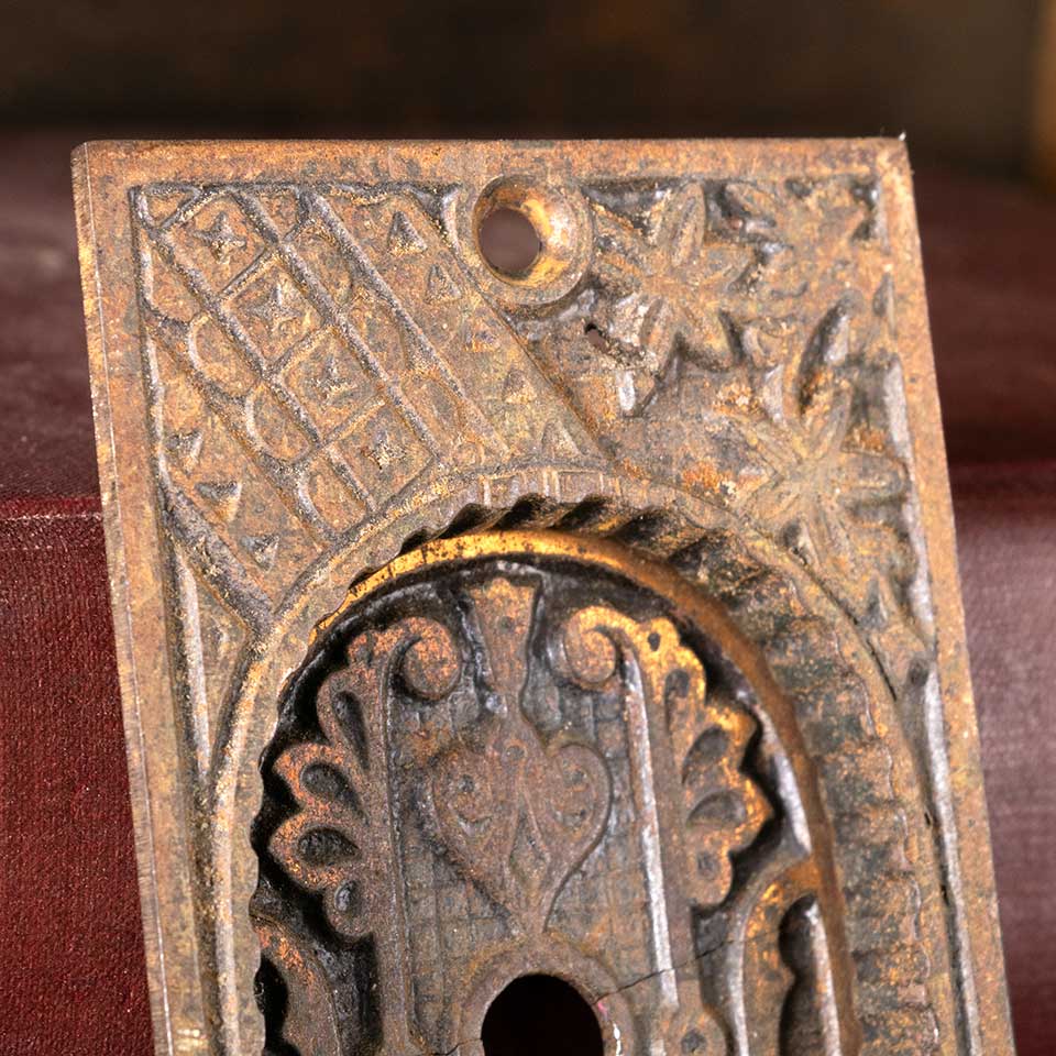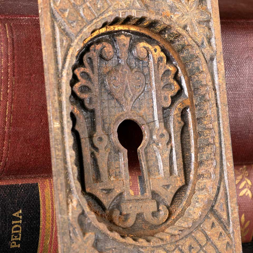 Architectural salvage antique ornate Victorian cast iron single pocket door pull handle hardware with a keyhole and Eastlake patterns measuring approx. 2 1/8" wide x 4 1/8" tall x 1/2" front to back with a recessed area 1 3/4" wide x 2 1/2" tall. This pull does have a crack across the backplate. See photos to evaluate condition.