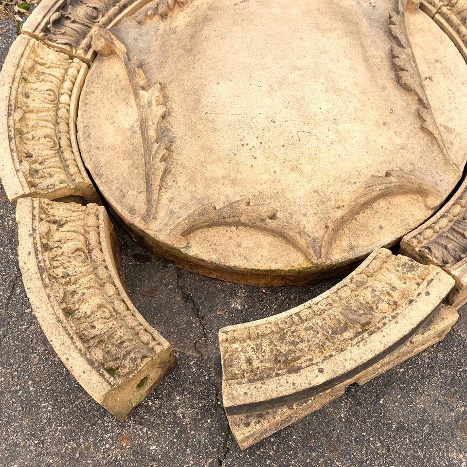 Architectural salvage antique nine piece terra cotta building medallion measuring approx. 42" in diameter x 7 1/2" front to back. This beautiful artifact was saved from Union Station in Columbus, Ohio when demolished in 1979. The train station was constructed in 1897 and designed by renowned Chicago architect Daniel Burnham. This is great opportunity to acquire a wonderful piece of architectural history. See photos to evaluate condition.