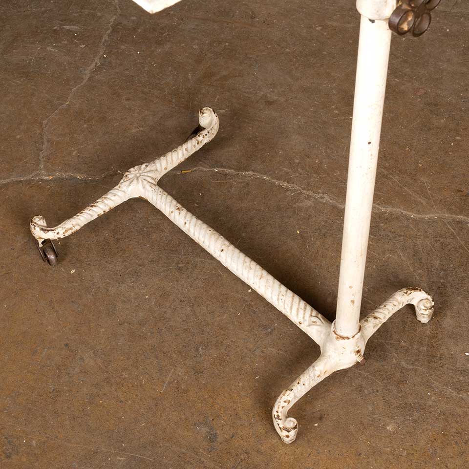 Antique adjustable writing / bed table with painted wood top and cast iron base measuring approx. 25 3/4" x 18" with an adjustable height from 26" to 43". See photos to evaluate condition.