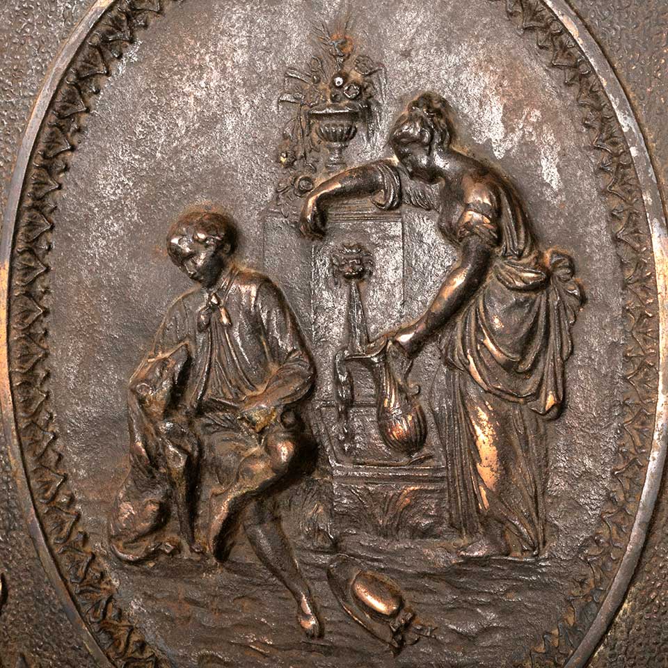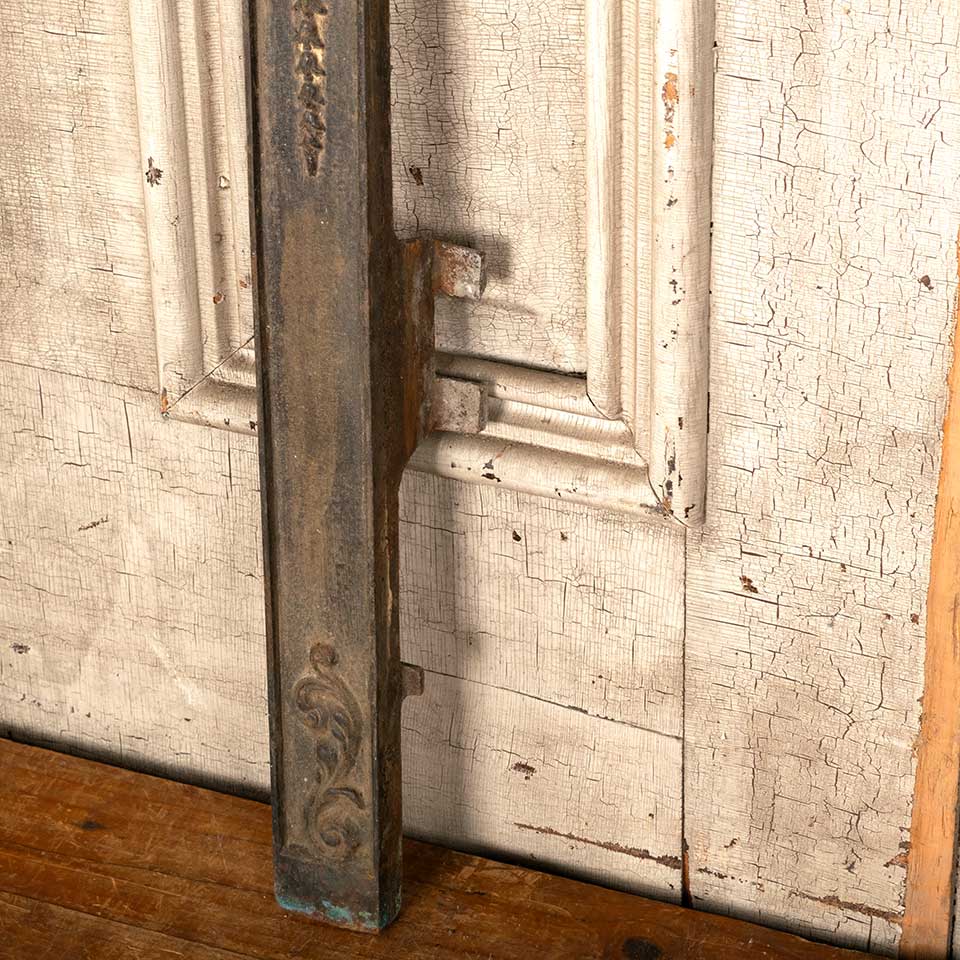 Architectural salvage antique cast iron fireplace surround and summer front cover with figural motif. The surround measures approx. 24 3/8" wide x 30 1/4" tall x 2" front to back and the summer front cover measures approx. 20 1/8" wide x 26 3/8" tall x 1" front to back. There's surface rust at the bottom of the summer front cover. See photos to evaluate condition. Priced at $650 for the 2 piece set.