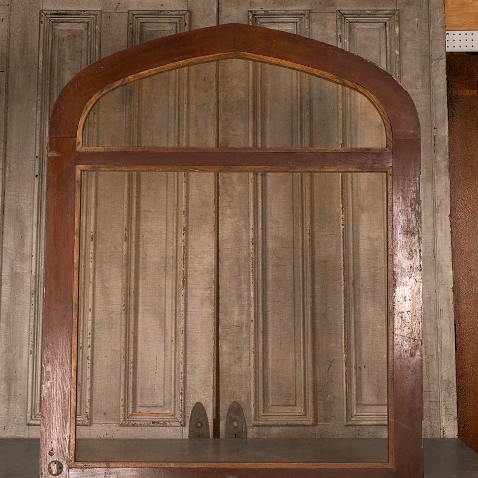 Architectural salvage antique oak wood pointed arch screen door measuring approx. 43 7/8" wide x 88 1/2" tall (at center) x 1 1/8" thick. See photos to evaluate condition.
