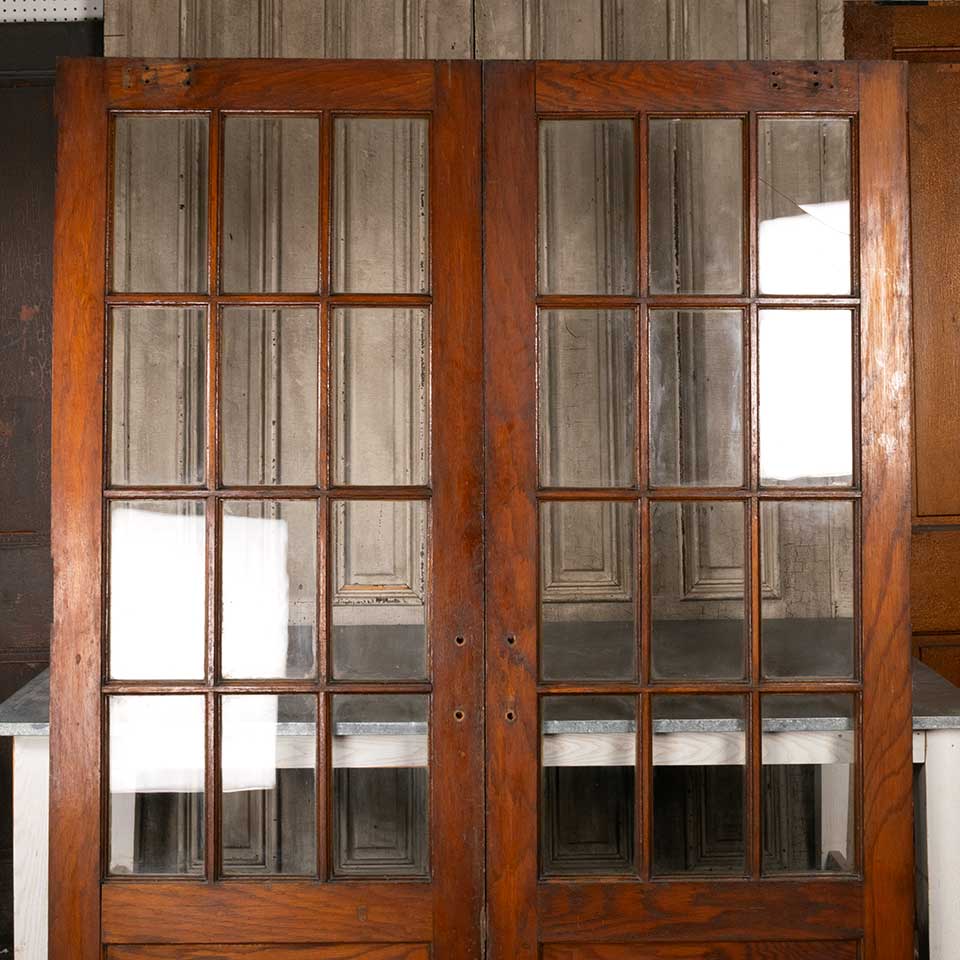 Pair of architectural salvage antique oak twelve lite French doors together measuring approx. 59 3/4" wide x 79 3/8" tall x 1 3/4" thick. There's a cracked pane of glass on one of the doors and holes from hardware. See photos to evaluate condition. Priced at $1,100 for the pair.