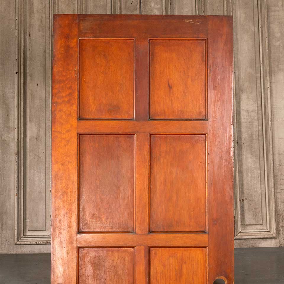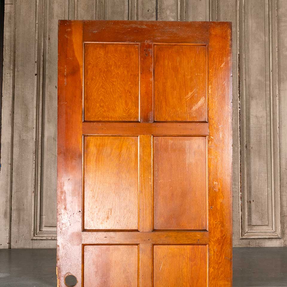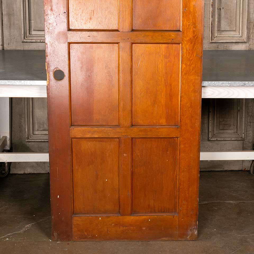 Architectural salvage antique wood eight panel interior door measuring approx. 29 7/8" wide x 79 1/2" tall x 1 3/8" thick. There are some screw holes visible on the door and some wood loss where the mortise lock was located. See photos to evaluate condition.