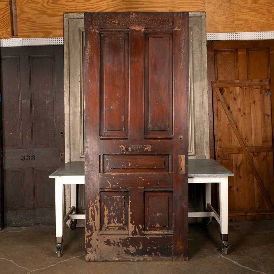 Architectural salvage antique five panel wood interior door measuring approx. 39 3/4" wide x 95 1/8" tall x 2" thick. There's a piece of wood broken off the bottom of the closing side of the door and some split wood along the bottom. See photos to evaluate condition.