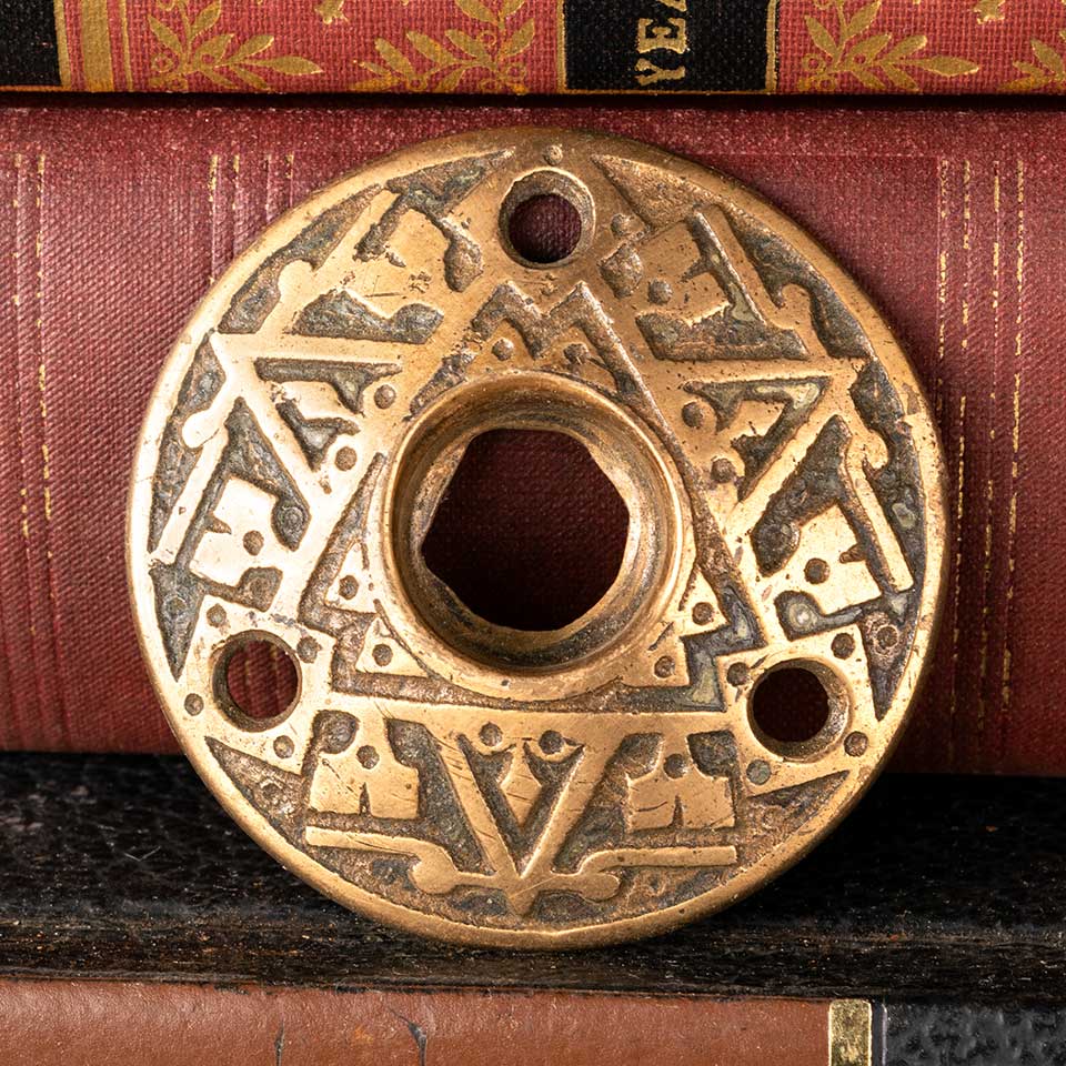 Architectural salvage antique ornate bronze doorknob rosette door hardware measuring approx. 2 1/8" in diameter with a 3/4" diameter collar. See photos to evaluate condition.