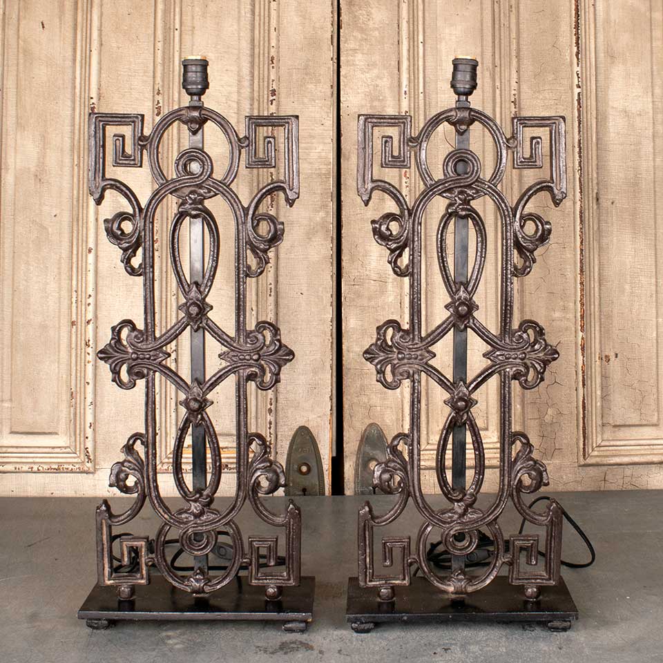 Pair of cast iron architectural salvage table lamps each measuring approx. 11 3/8" wide x 31 1/2" tall with a 12 3/4" x 6" base. See photos to evaluate condition. Salvaged lighting should be inspected by a licensed electrician prior to installation. Priced at $375 for the pair.