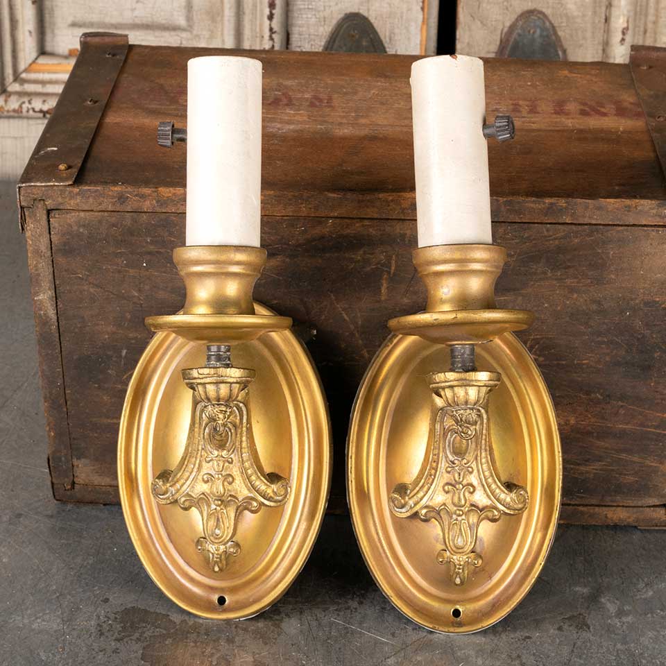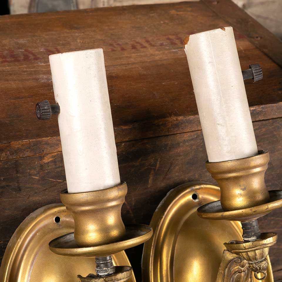 Pair of architectural salvage antique brass wall sconce light fixtures each measuring approx. 4 3/8" wide x 10 3/4" tall x 4 1/2" front to back. See photos to evaluate condition. Salvaged lighting should be inspected by a licensed electrician prior to installation. Priced at $150 for the pair.