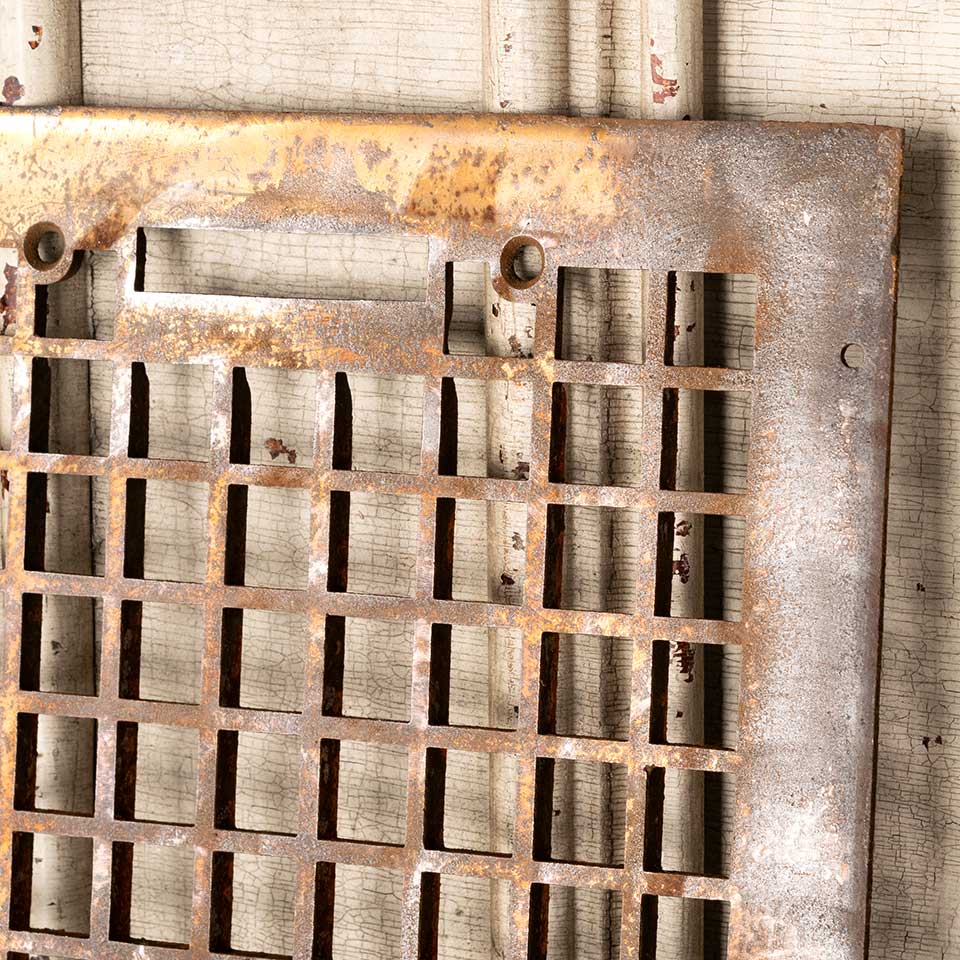 Architectural salvage antique cast iron heat grate floor vent cover measuring approx. 10" x 13 7/8" (insert dimensions) and 12" x 15 7/8" (overall dimensions). There are no louvers with this heat grate. See photos to evaluate condition.