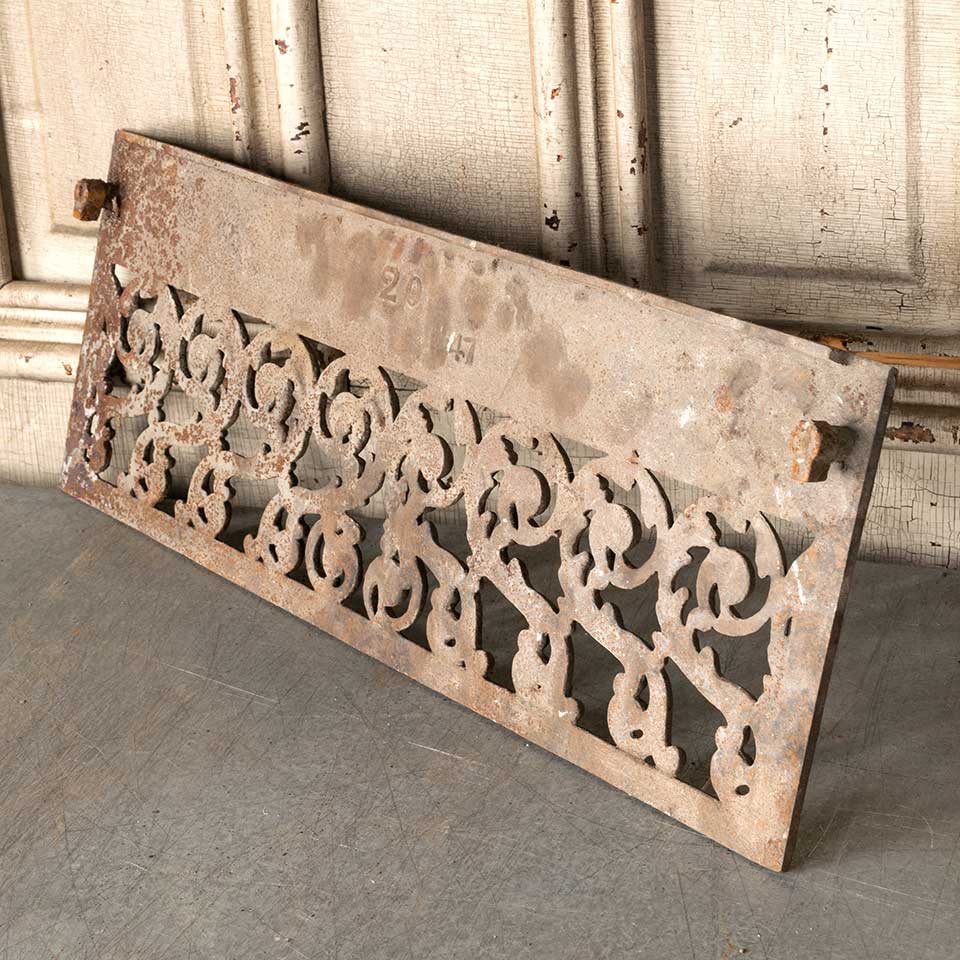 Architectural salvage antique ornate cast iron fireplace ember screen grate measuring approx. 20 1/4" wide x 7 7/16" tall x 1 1/8" front to back. See photos to evaluate condition.
