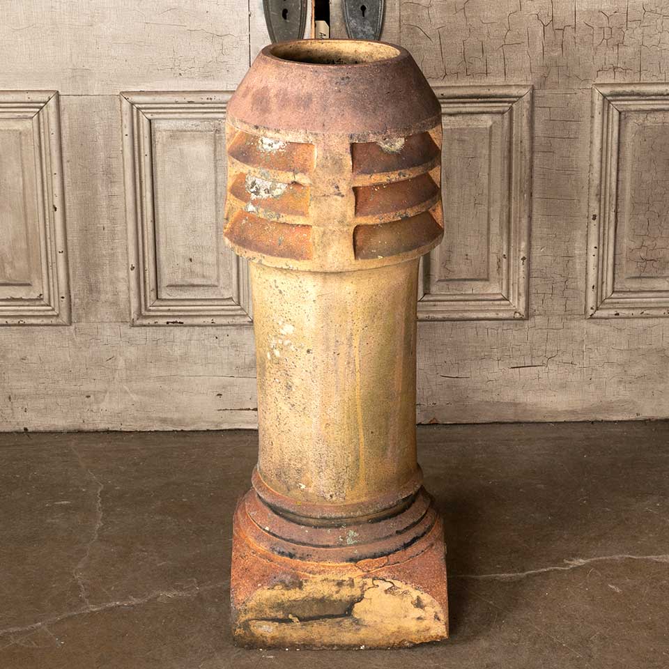 Architectural salvage antique terra cotta louvered top chimney pot measuring approx. 35" tall x 12 1/2" in diameter with a 13" square base. Chimney pots make great garden ornaments! See photos to evaluate condition.
