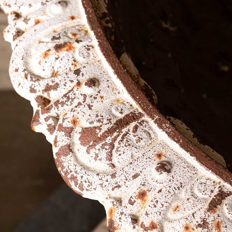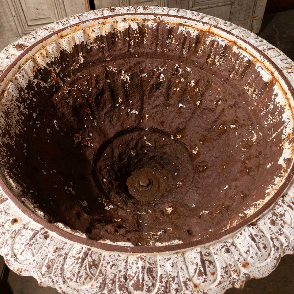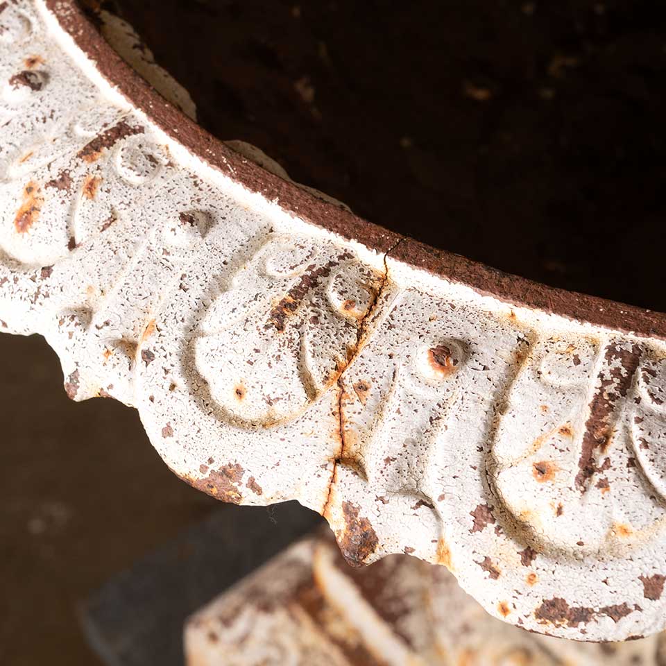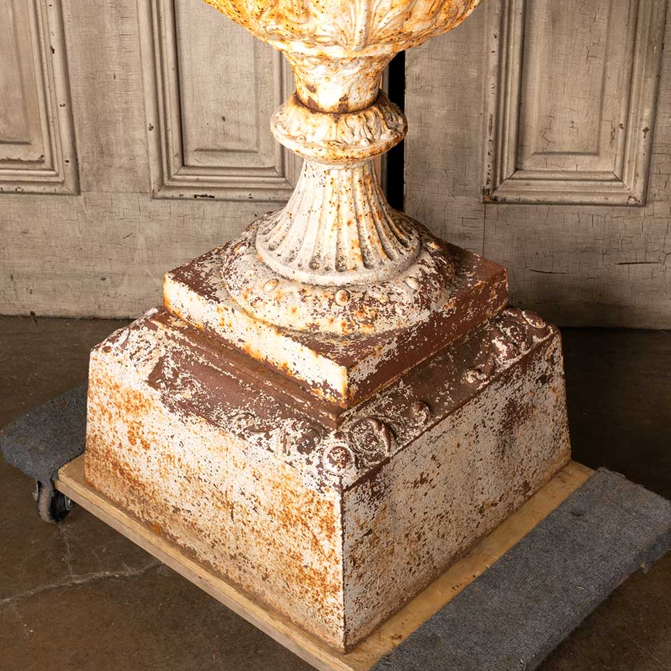 Architectural salvage two piece cast iron garden urn planter and pedestal measuring approx. 23" in diameter x 31 1/4" tall with a 117" x 17" base. See photos to evaluate condition. Priced at $1,500 for the two piece set.