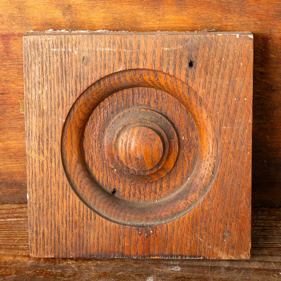 Architectural salvage antique interior window or door oak rosette trim block measuring approx. 6" square x 1 1/8" front to back. Color and condition may vary, see photos to evaluate. Priced at $15/each.