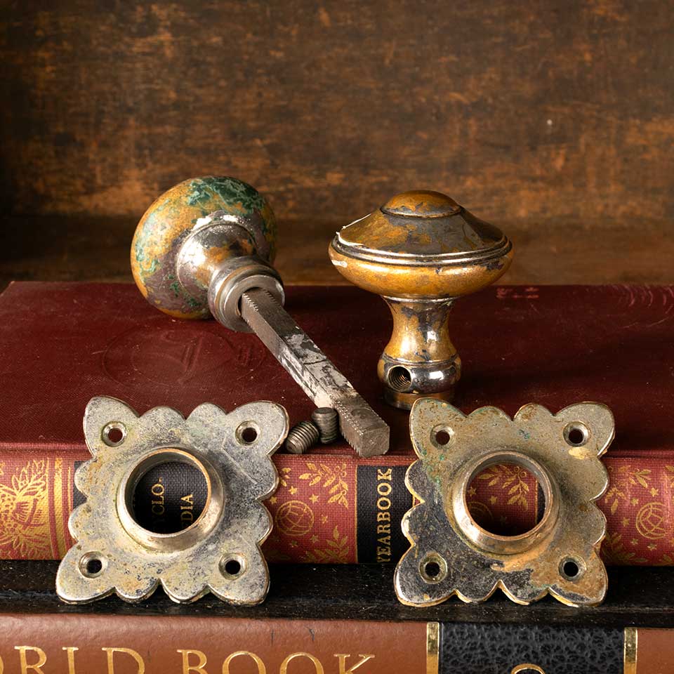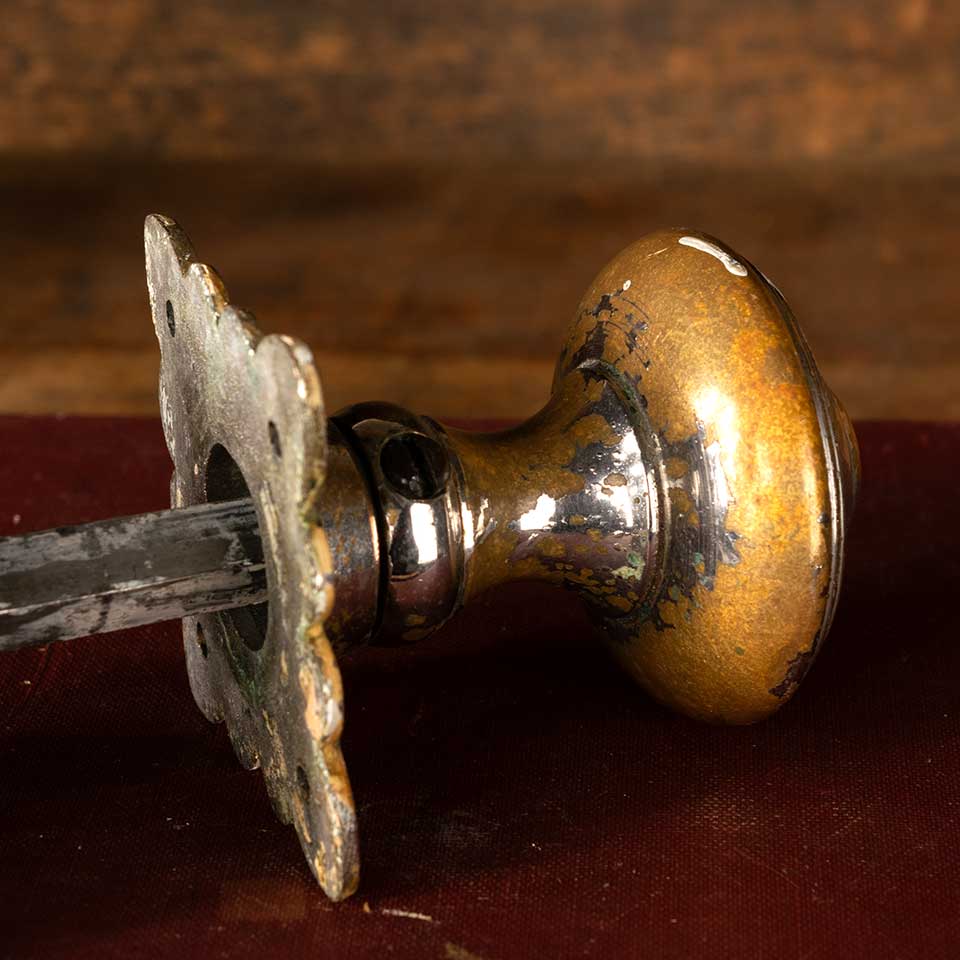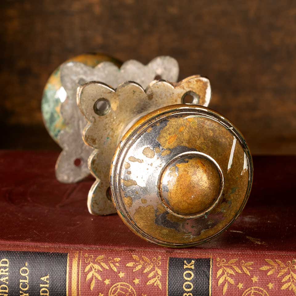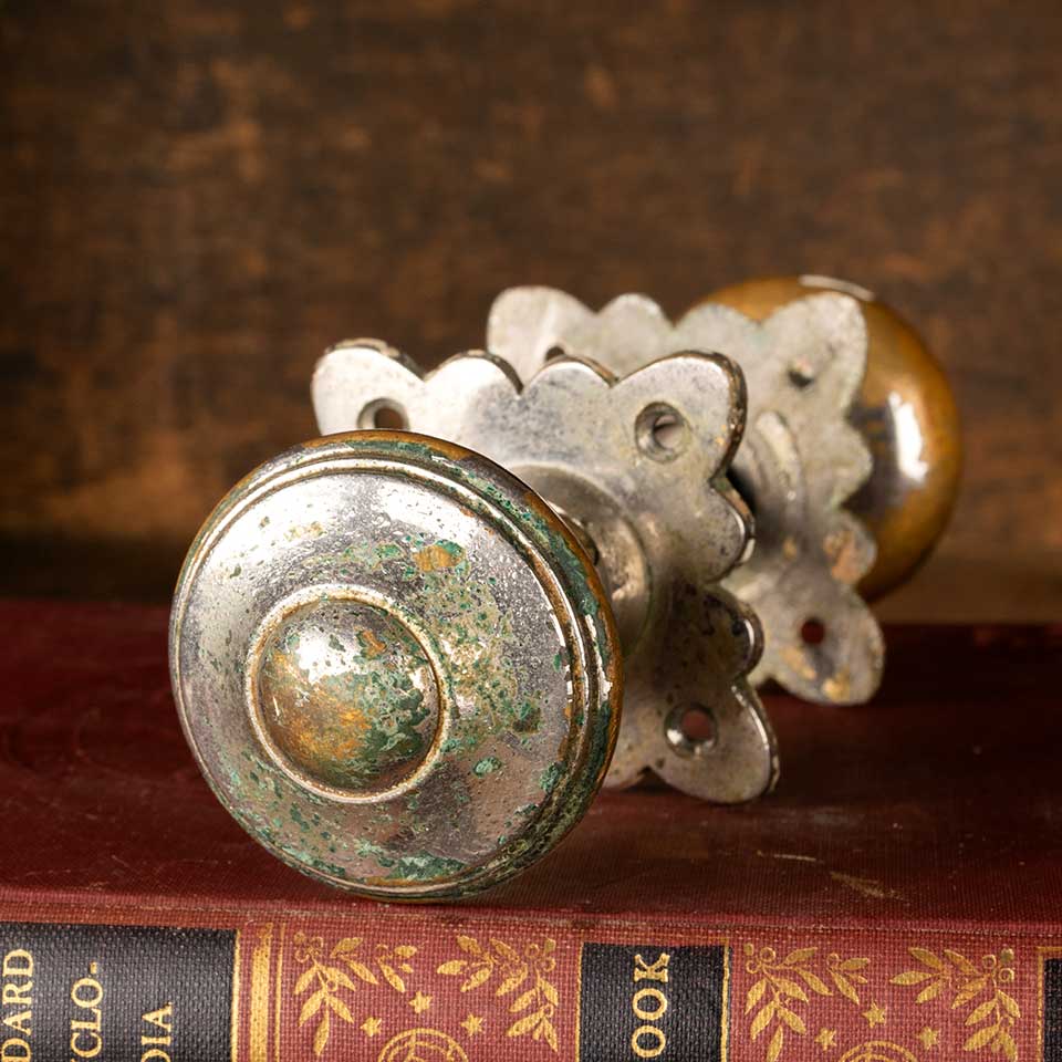 Architectural salvage antique Tudor brass 1 3/4" diameter doorknobs door hardware set with worn nickel plating including a pair of backplates (2 5/8" x 1 7/8") and a threaded spindle with set screws. Color and condition may vary, see photos to evaluate. Priced at $195/set.