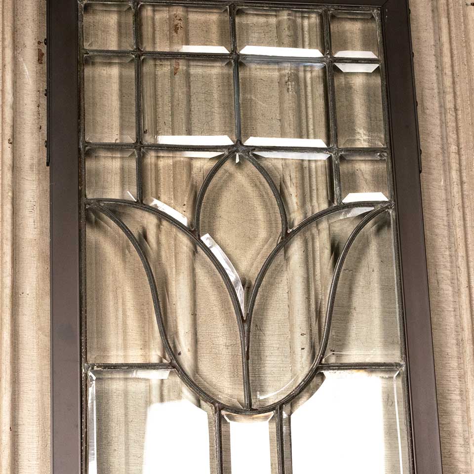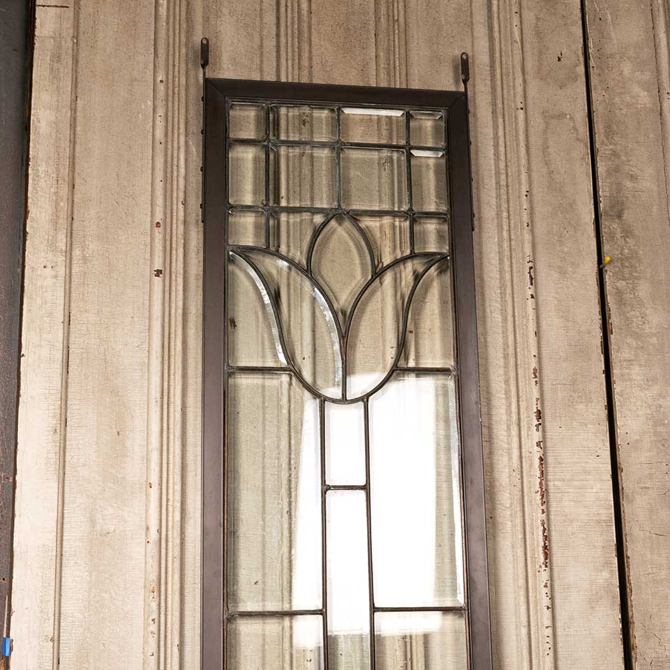 Architectural salvage antique leaded beveled glass side lite window panel with metal frame measuring approx. 17" wide x 86 5/8" tall x 1/2" front to back. One pane is chipped. See photos to evaluate condition.