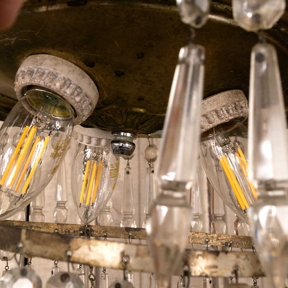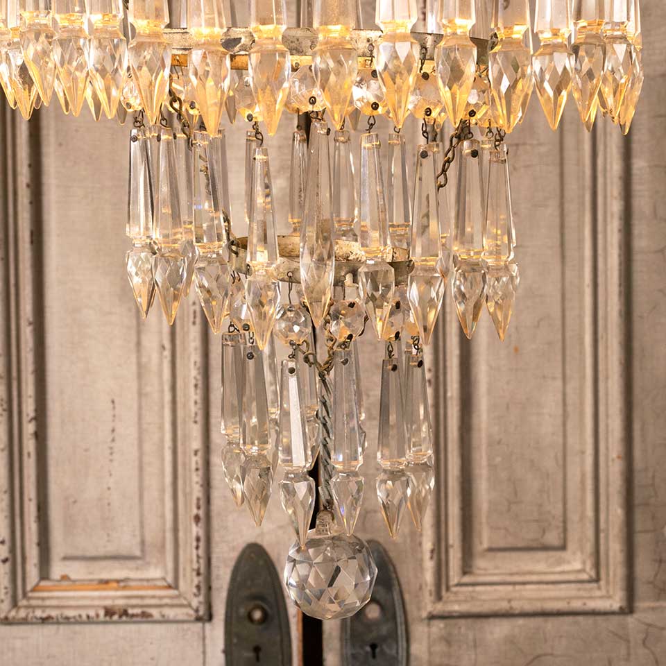 Architectural salvage vintage three light four tier chandelier with glass prisms measuring approx. 16" in diameter x 17" tall. See photos to evaluate condition. Salvaged lighting should be inspected by a licensed electrician prior to installation.