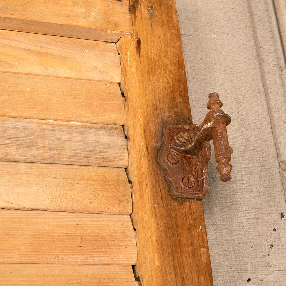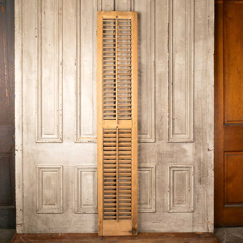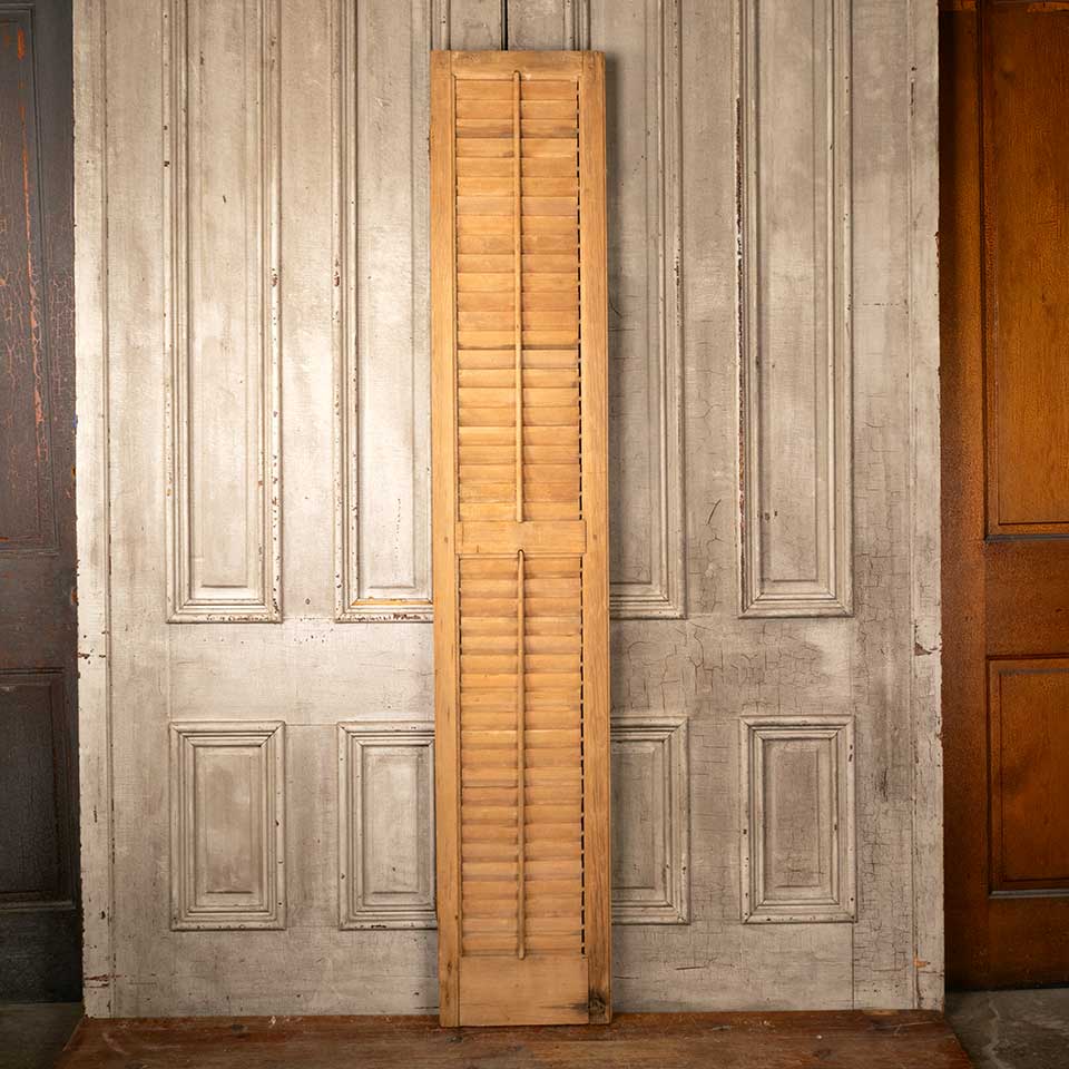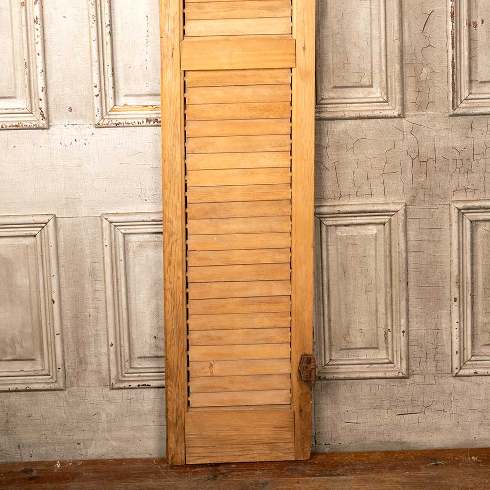 Architectural salvage antique louvered exterior wood window shutter measuring approx. 14 1/2" wide x 80" tall x 1 3/8" thick. See photos to evaluate condition.