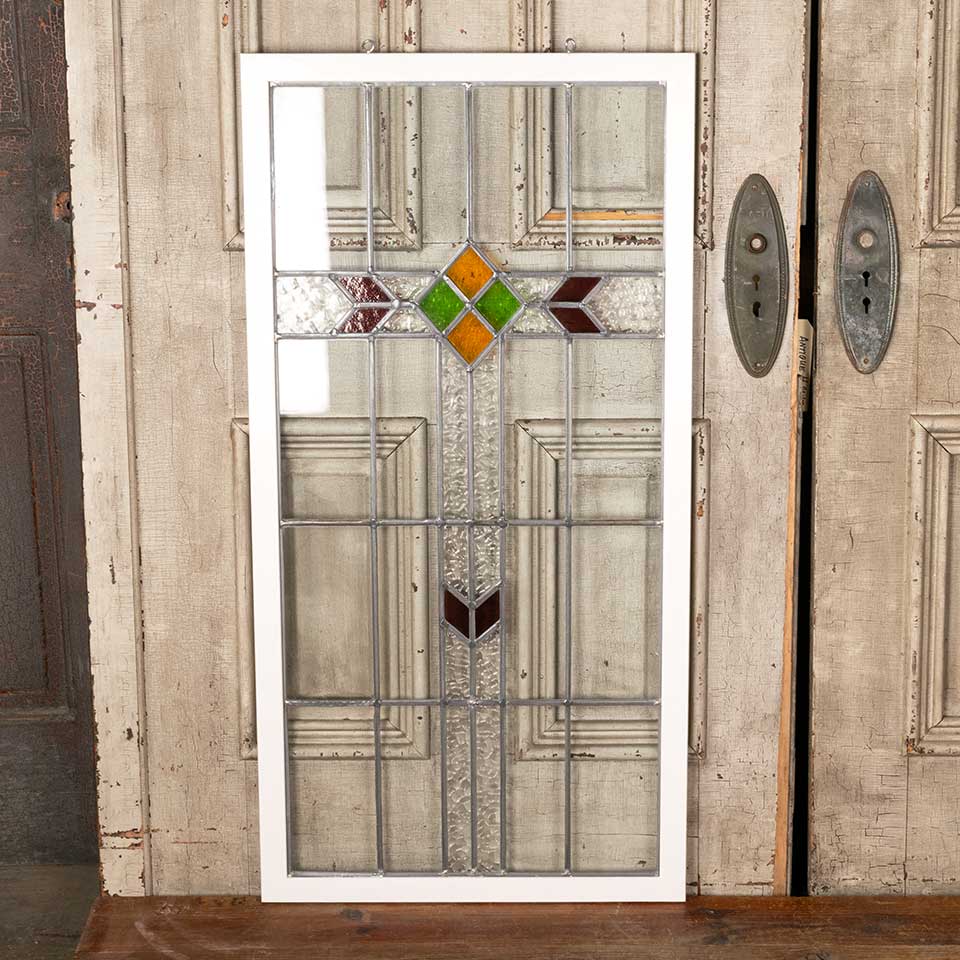 Architectural salvage antique stained and leaded glass window measuring approx. 21 3/4" wide x 42 1/2" tall x 3/4" thick. See photos to evaluate condition.