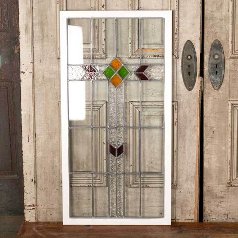 Architectural salvage antique stained and leaded glass window measuring approx. 21 3/4" wide x 42 1/2" tall x 3/4" thick. See photos to evaluate condition.