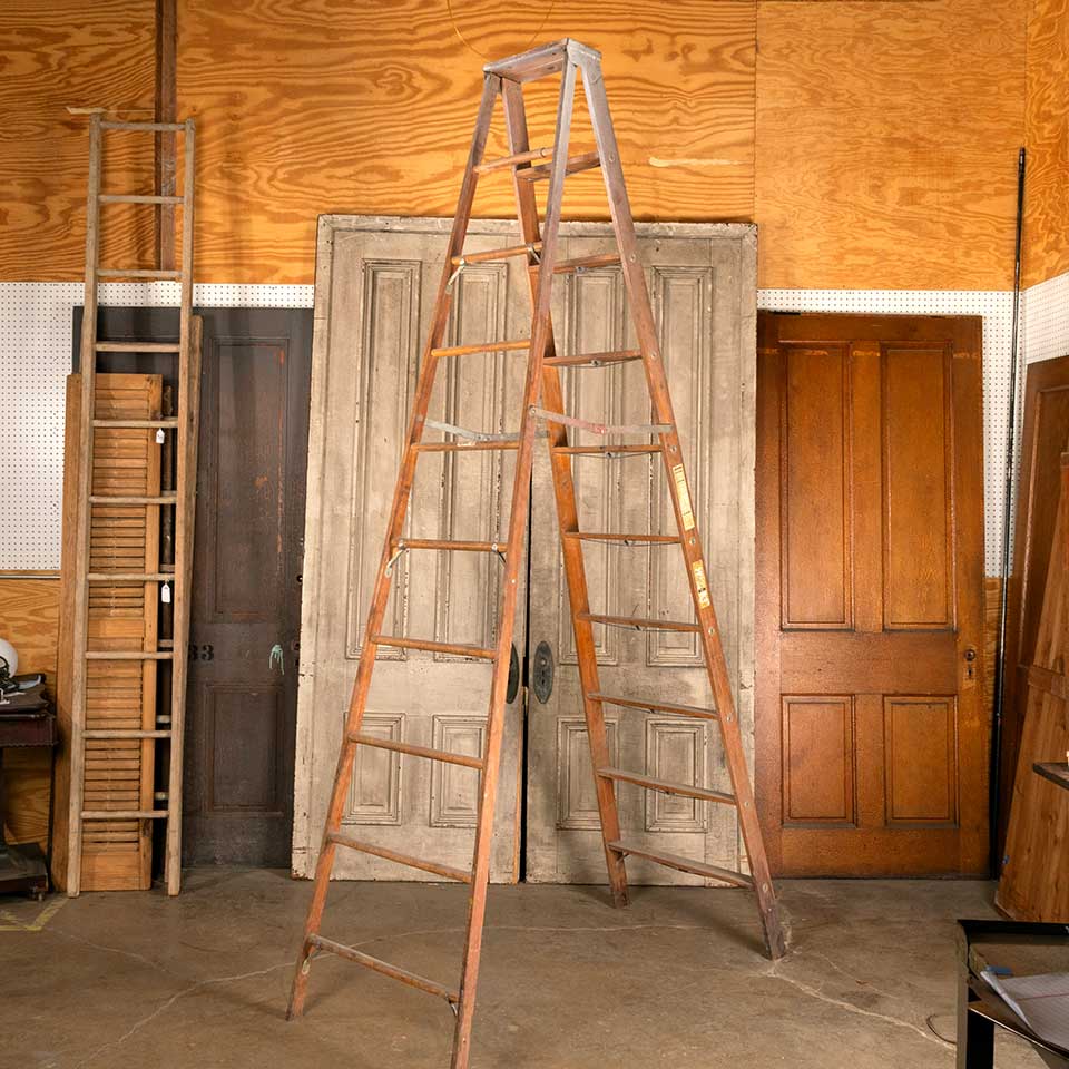 Vintage WERNER nine rung A-frame wood step ladder measuring approx. 28 1/2" wide (at base) x 10' tall x 63 1/2" front to back (at base when extended). See photos to evaluate condition. This ladder is being sold for decorative use only.