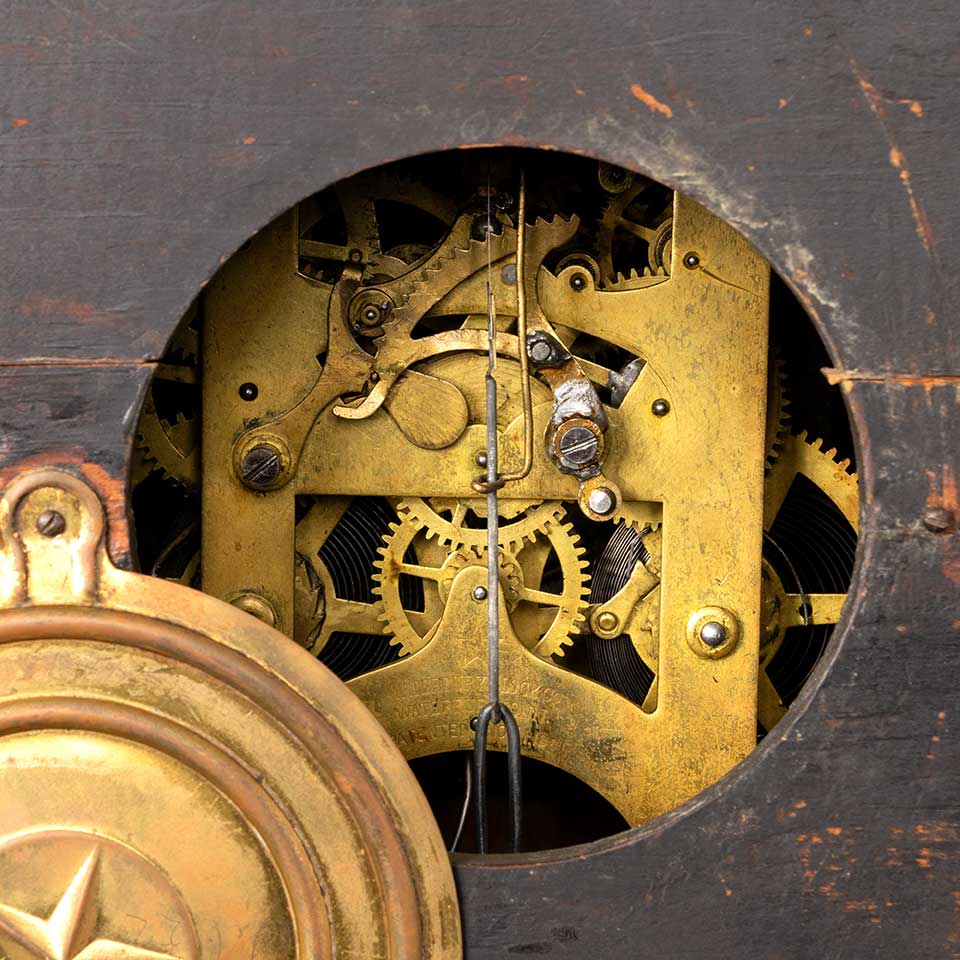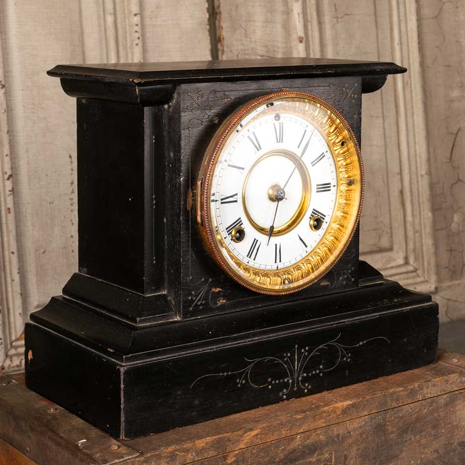 Antique Victorian Waterbury Clock Company mantel / mantle clock and key measuring approx. 11 5/8" wide x 9 1/4" tall x 5 1/2" front to back. See photos to evaluate condition.