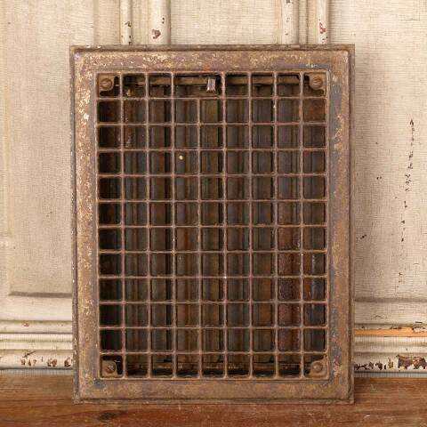 Architectural salvage antique stamped metal heat grate floor vent cover with operable louvers measuring approx. 9" x 12" (insert dimensions) and 10 15/16" x 13 7/8" (overall dimensions). See photos to evaluate condition.