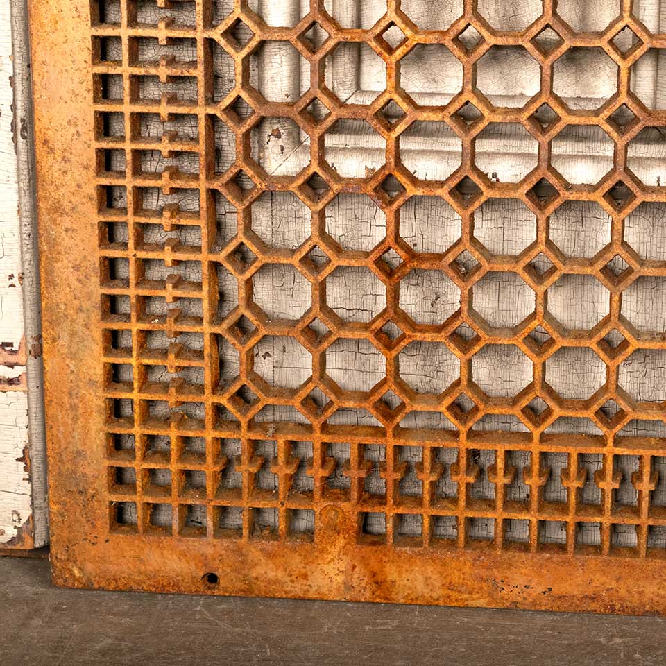 Architectural salvage large antique cast iron cold air return floor grate vent cover measuring approx. 29 3/4" x 29 3/4" (insert dimensions) and 32" x 32" (overall dimensions). See photos to evaluate condition.