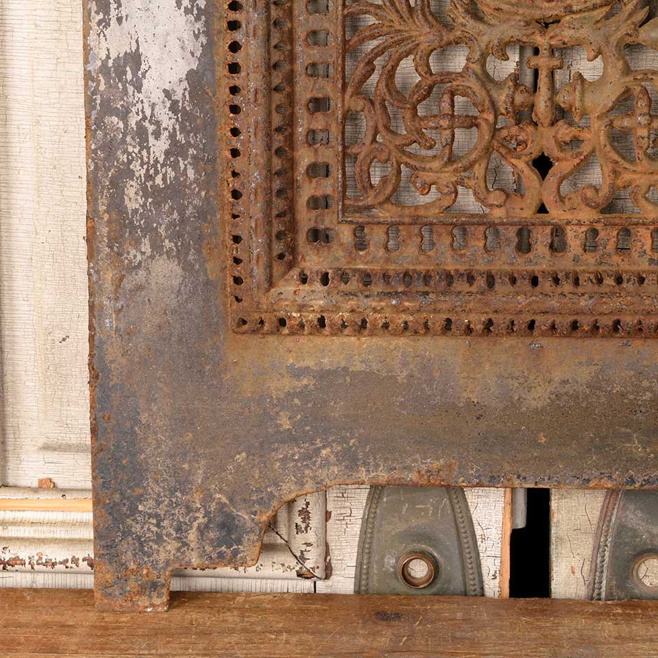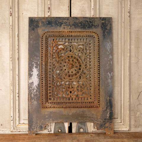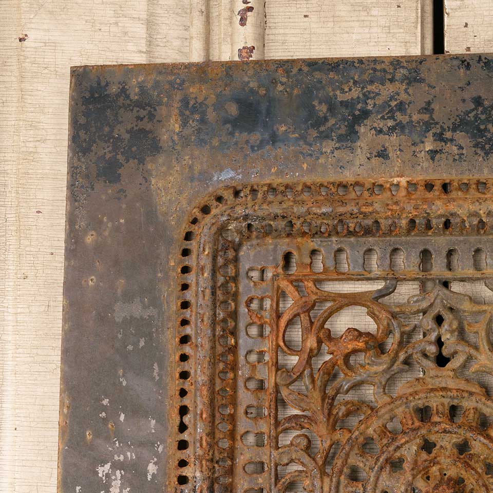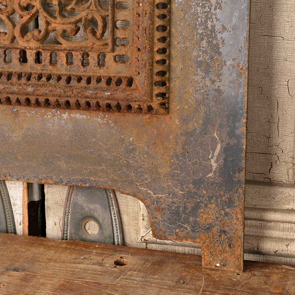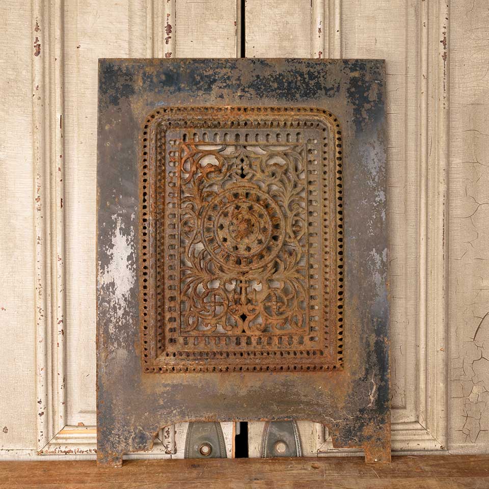 Architectural salvage antique ornate cast iron fireplace summer front cover measuring approx. 20 1/8" wide x 28 3/8" tall x 1" front to back. See photos to evaluate condition.