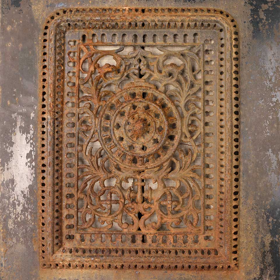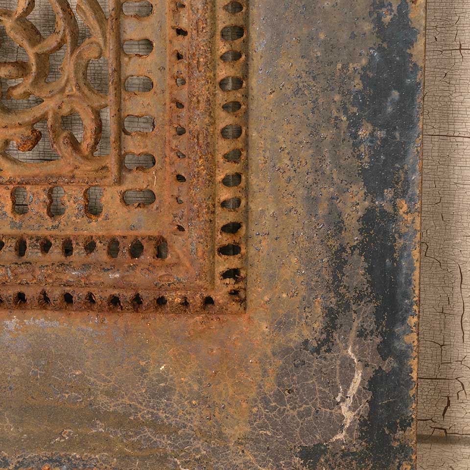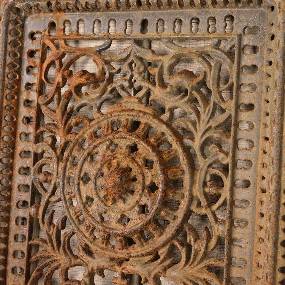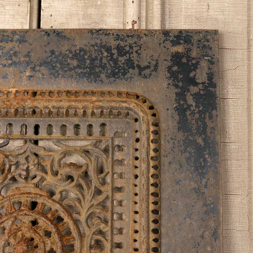 Architectural salvage antique ornate cast iron fireplace summer front cover measuring approx. 20 1/8" wide x 28 3/8" tall x 1" front to back. See photos to evaluate condition.