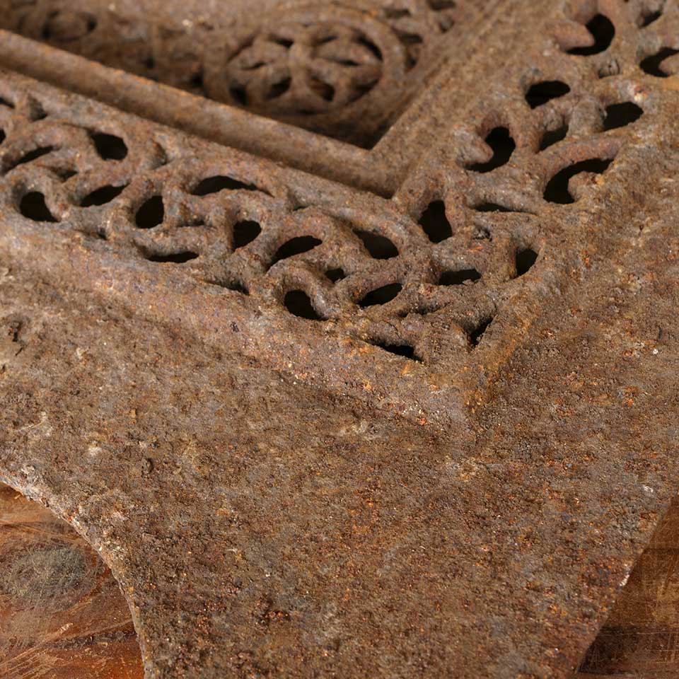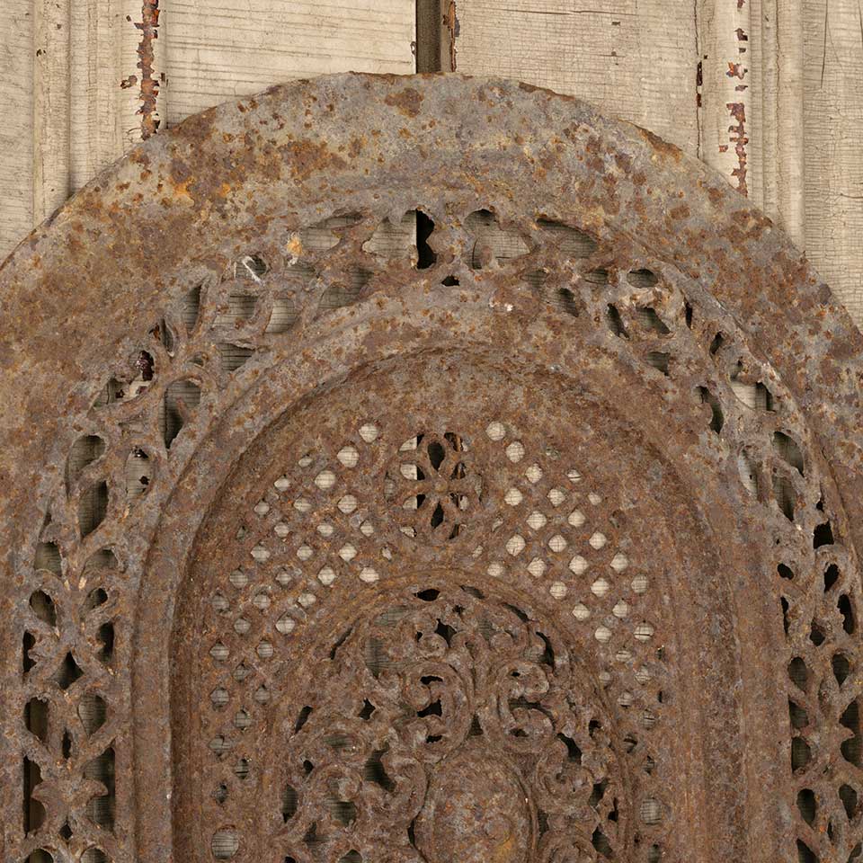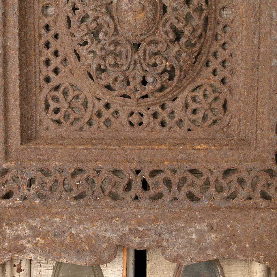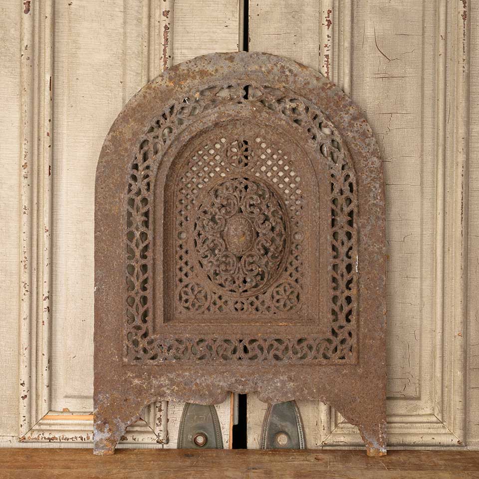 Architectural salvage antique ornate arched top cast iron fireplace summer front cover measuring approx. 18 3/4" wide x 26 3/8" tall x 2" front to back. There's surface rust and pitting in the metal. See photos to evaluate condition.