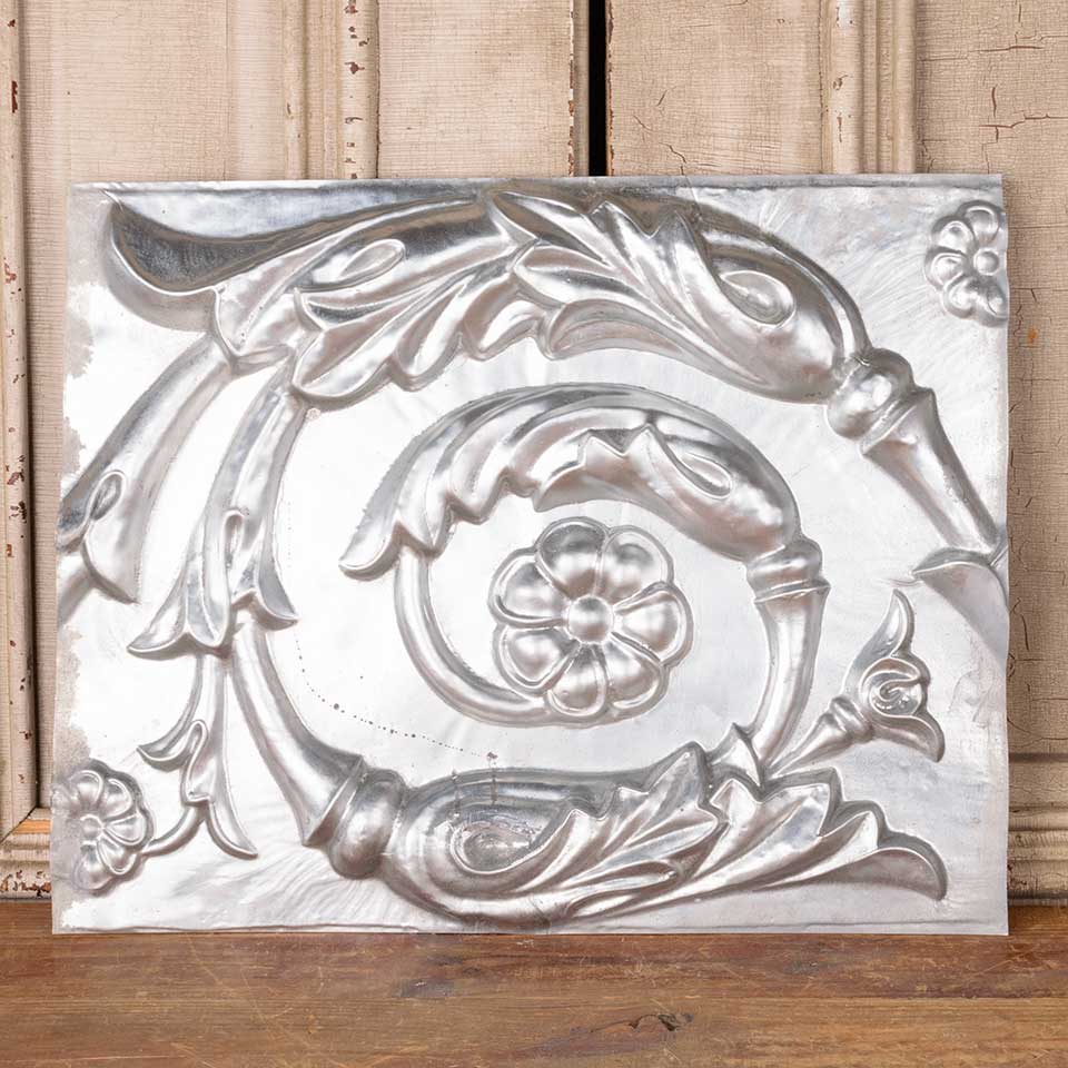Architectural salvage antique old new stock pressed / stamped tin metal frieze panel with high relief measuring approx. 20 1/2" wide x 16 1/2" tall x 1 1/2" front to back. Color and condition may vary. Priced at $75/each.