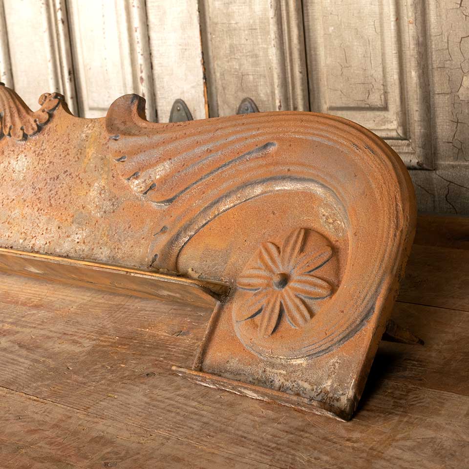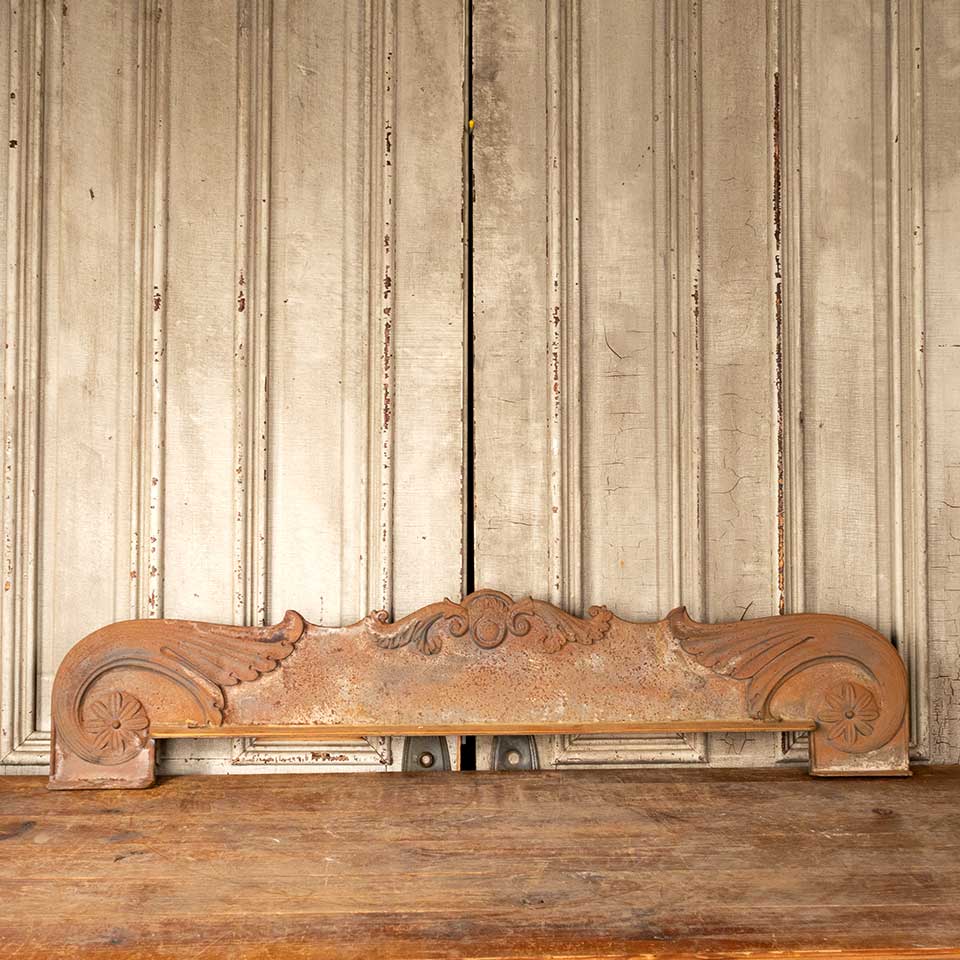 Architectural salvage antique cast iron pediment measuring approx. 51 1/4" wide x 11 1/4" tall x 5" front to back. See photos to evaluate condition.