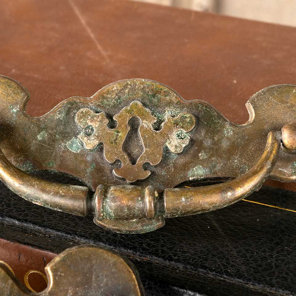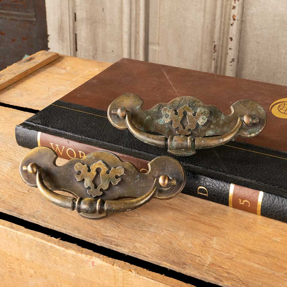 Pair of vintage brass furniture hardware drawer bail pulls with a keyhole motif each measuring approx. 5 1/8" wide x 2" tall x 3/4" front to back with mounting holes 4" on center. Mounting screws included. See photos to evaluate condition. Priced at $15 for the pair.