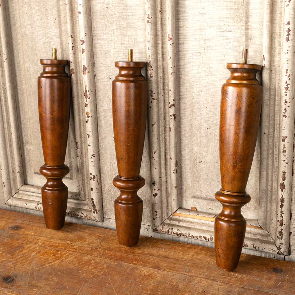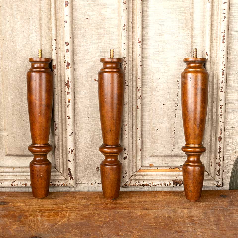 Set of three turned wood table legs each measuring approx. 2 1/2" diameter x 13" tall. See photos to evaluate condition. Priced at $45 for the set of three.