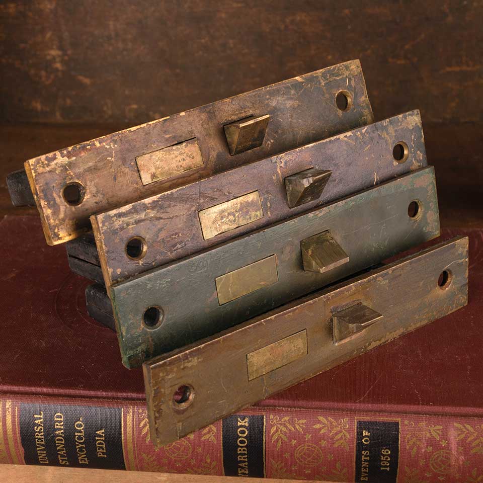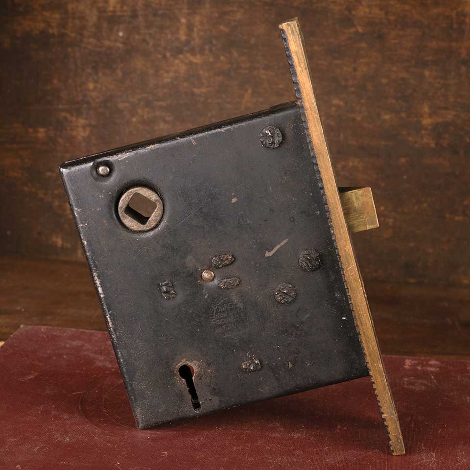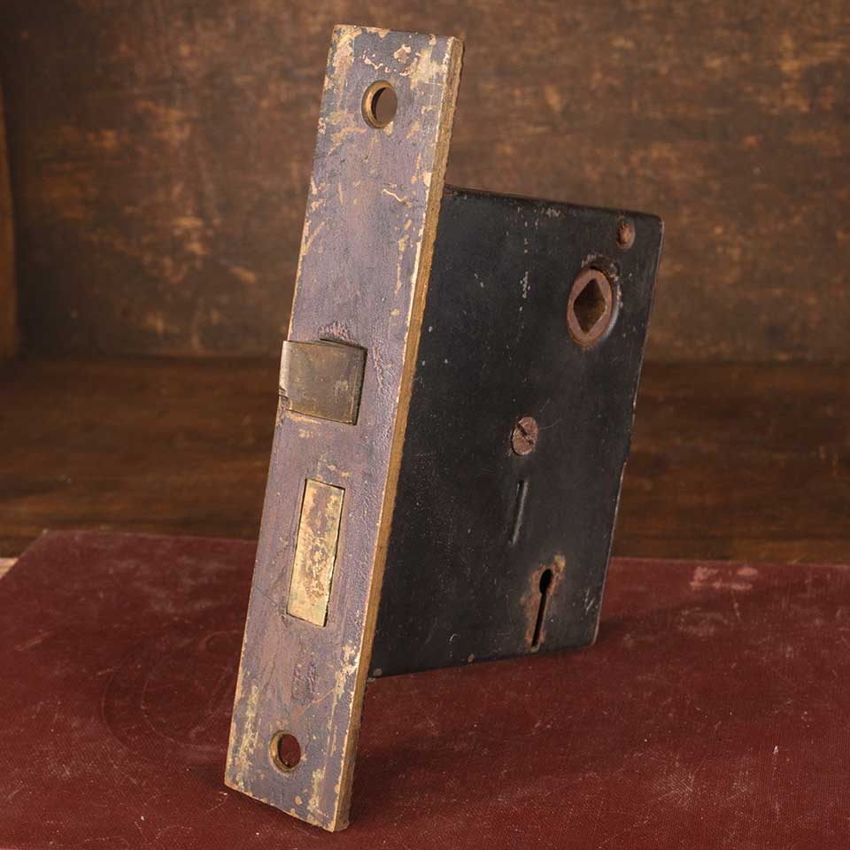 Architectural salvage antique brass and cast iron Russell & Erwin reversible interior door mortise latch lock hardware with skeleton keyhole deadbolt. Measurements: faceplate 1 1/8" wide x 5 1/2" tall x 1/8" thick and body 5/8" wide x 3 1/2" tall x 3 1/16 front to back with a 2 1/2" backset. Spindle and keyholes measure 2 1/2" on center. Key and strike plate NOT included. Color and condition vary, see photos to evaluate. Priced at $20/each.