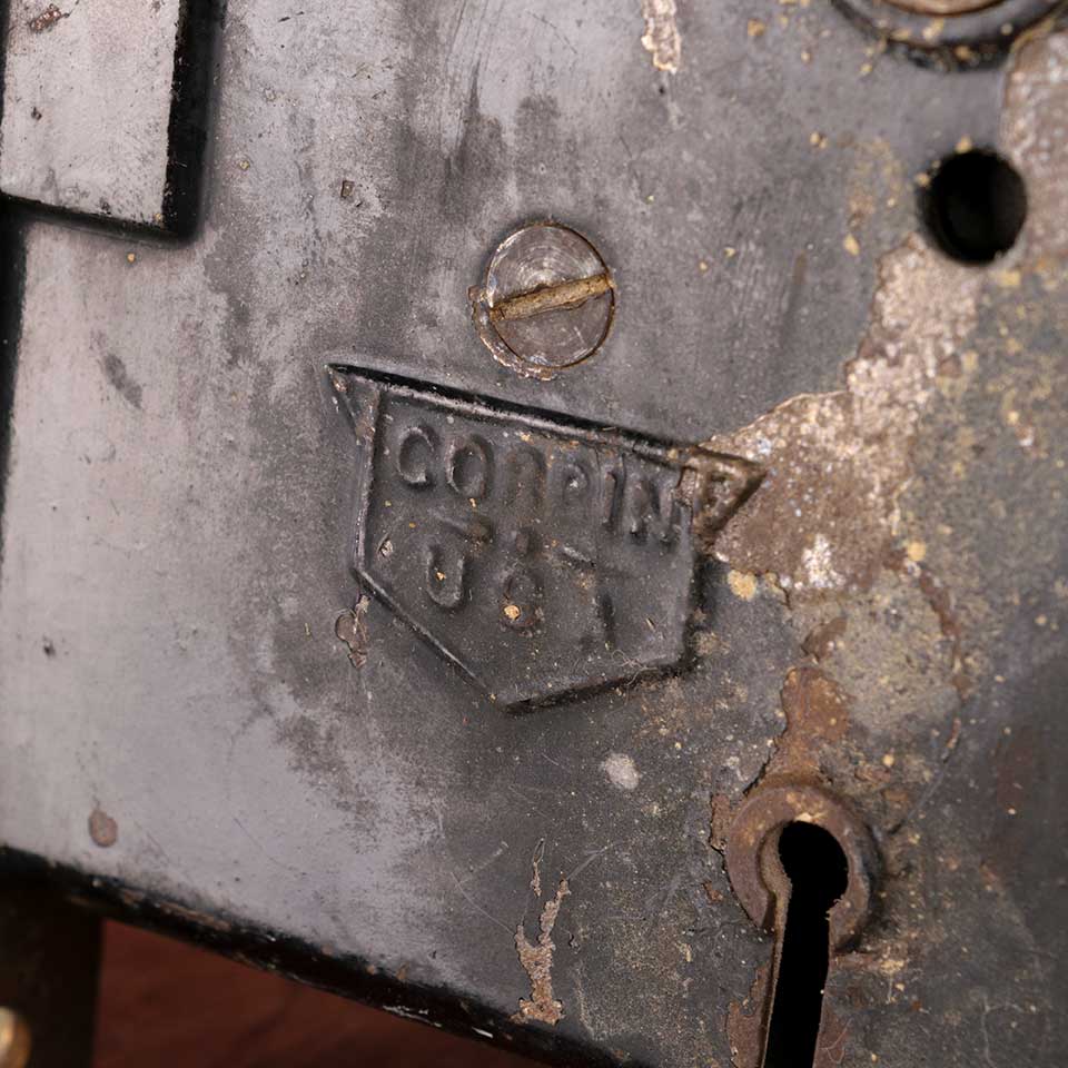 Architectural salvage antique brass and cast iron Corbin USA reversible interior door mortise latch lock hardware with skeleton keyhole deadbolt. Measurements: faceplate 1" wide x 5 3/4" tall x 1/8" thick and body 5/8" wide x 3 3/4" tall x 3 1/4 front to back with a 2 1/2" backset. Spindle and keyholes measure 2 1/2" on center. Key and strike plate NOT included. Color and condition vary, see photos to evaluate. Priced at $20/each.