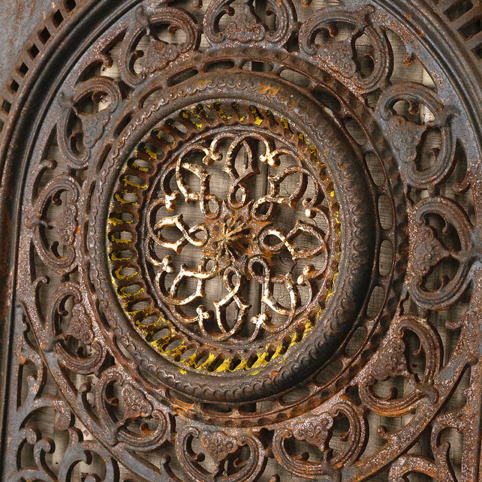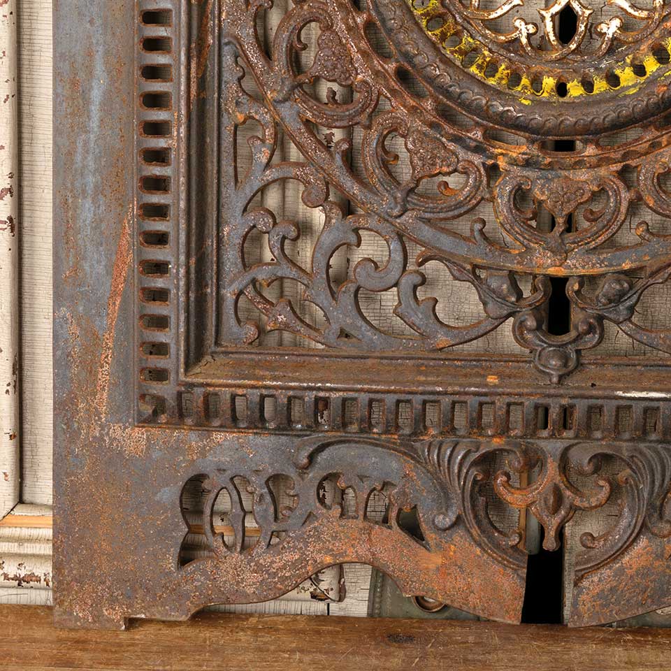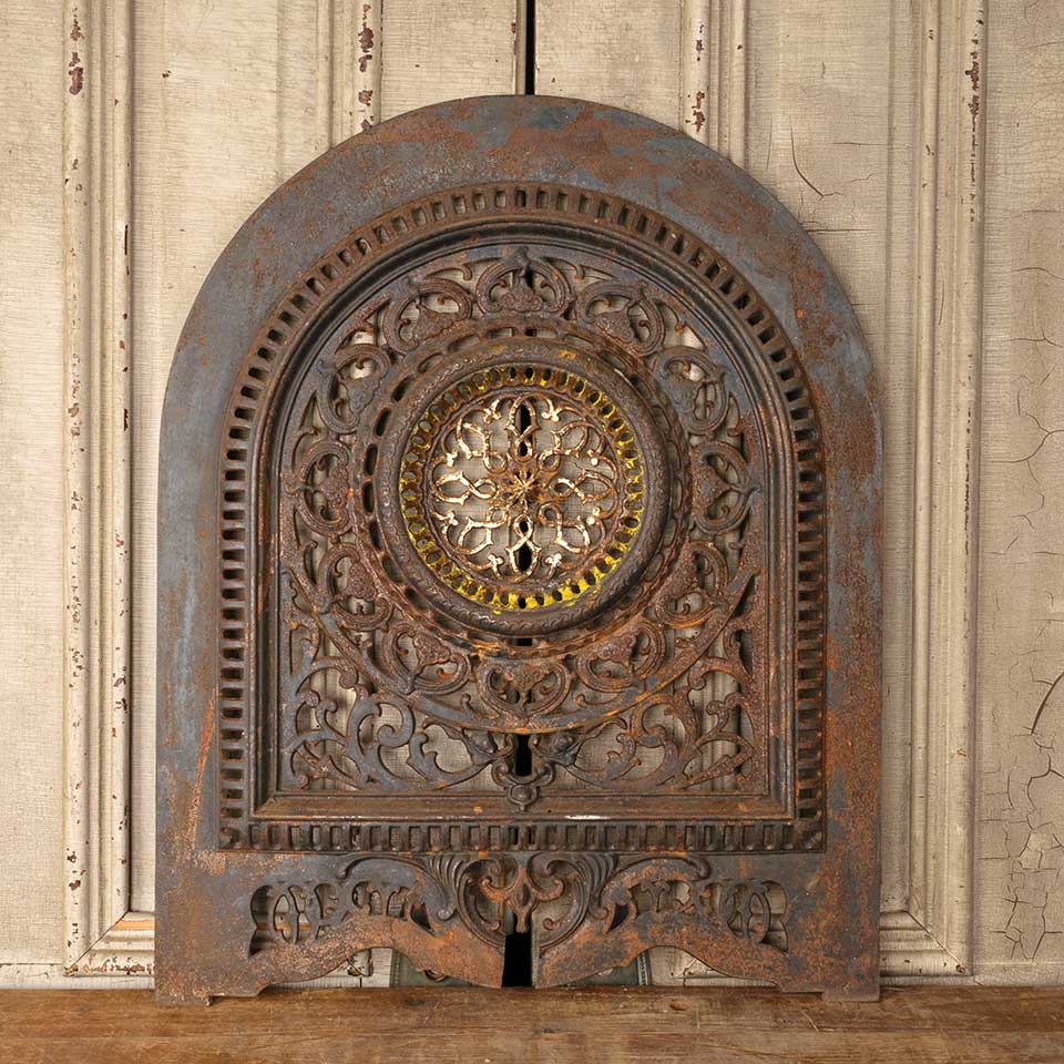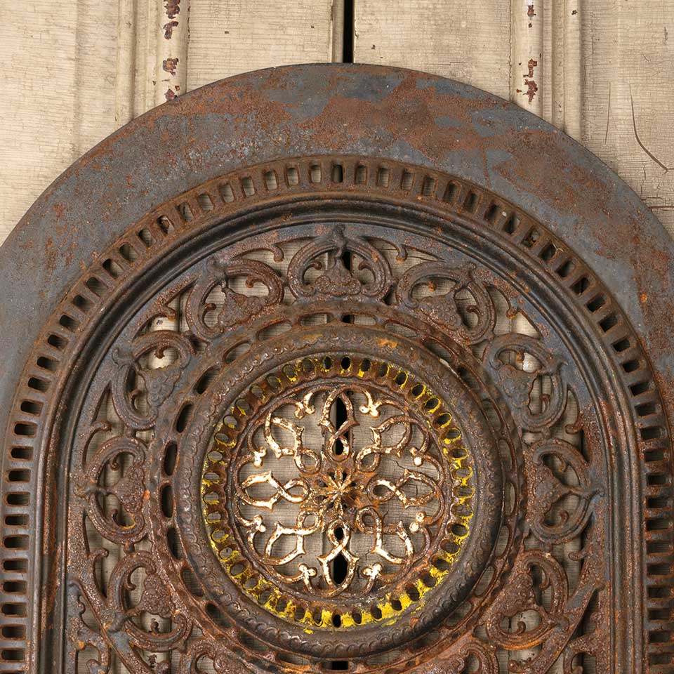 Architectural salvage antique ornate arched top cast iron fireplace summer front cover measuring approx. 22 7/8" wide x 28 3/4" tall x 1" front to back. A piece at the bottom may have been cut out at some point in its history. See photos to evaluate condition.