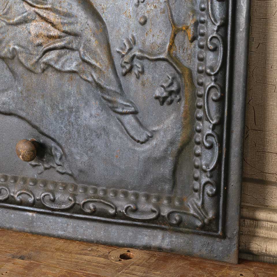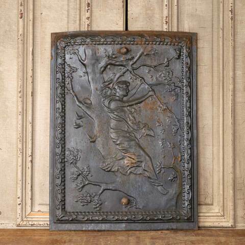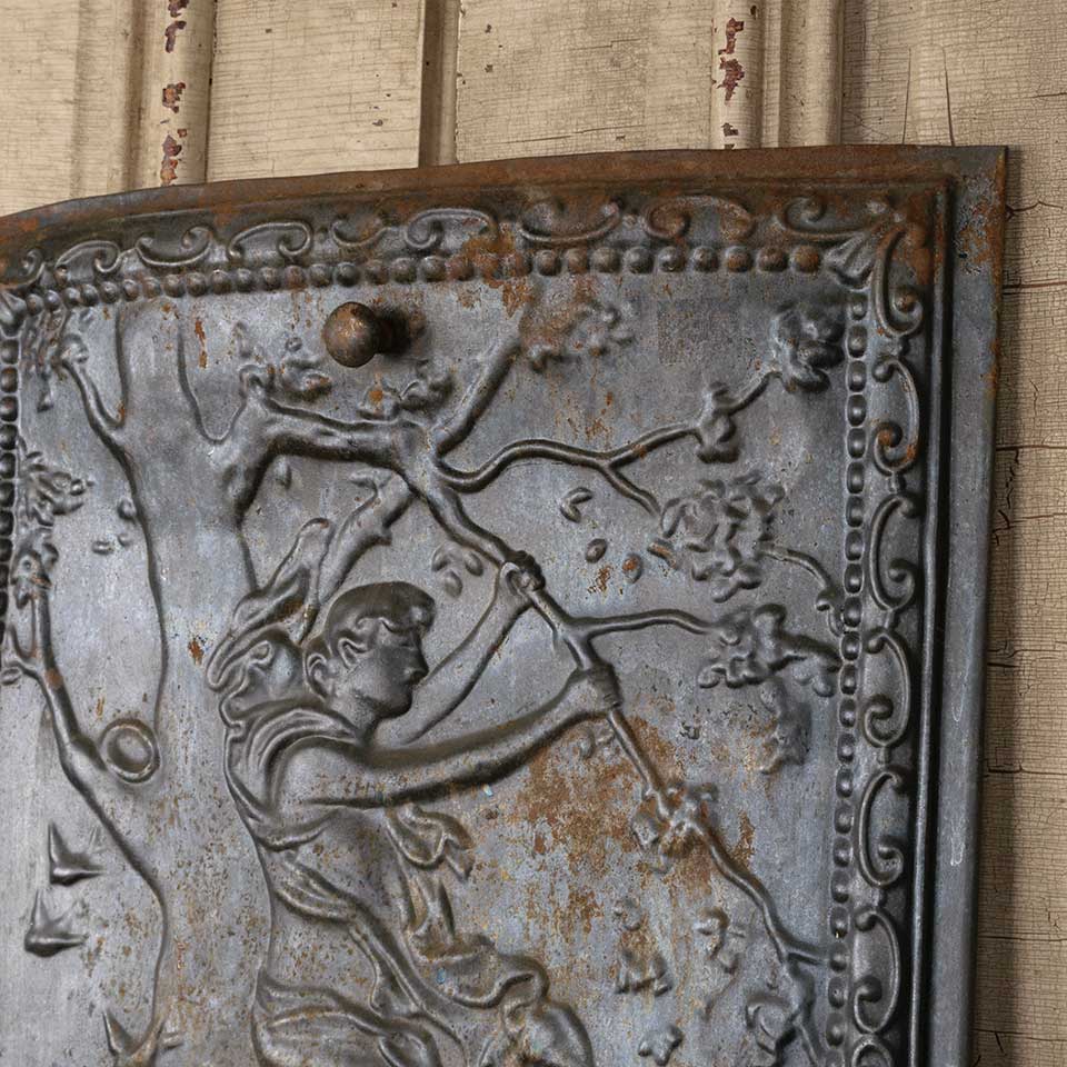Architectural salvage antique stamped / pressed metal fireplace summer front cover with figural motif measuring approx. 19 7/8" wide x 26 3/4" tall x 2" front to back. See photos to evaluate condition.