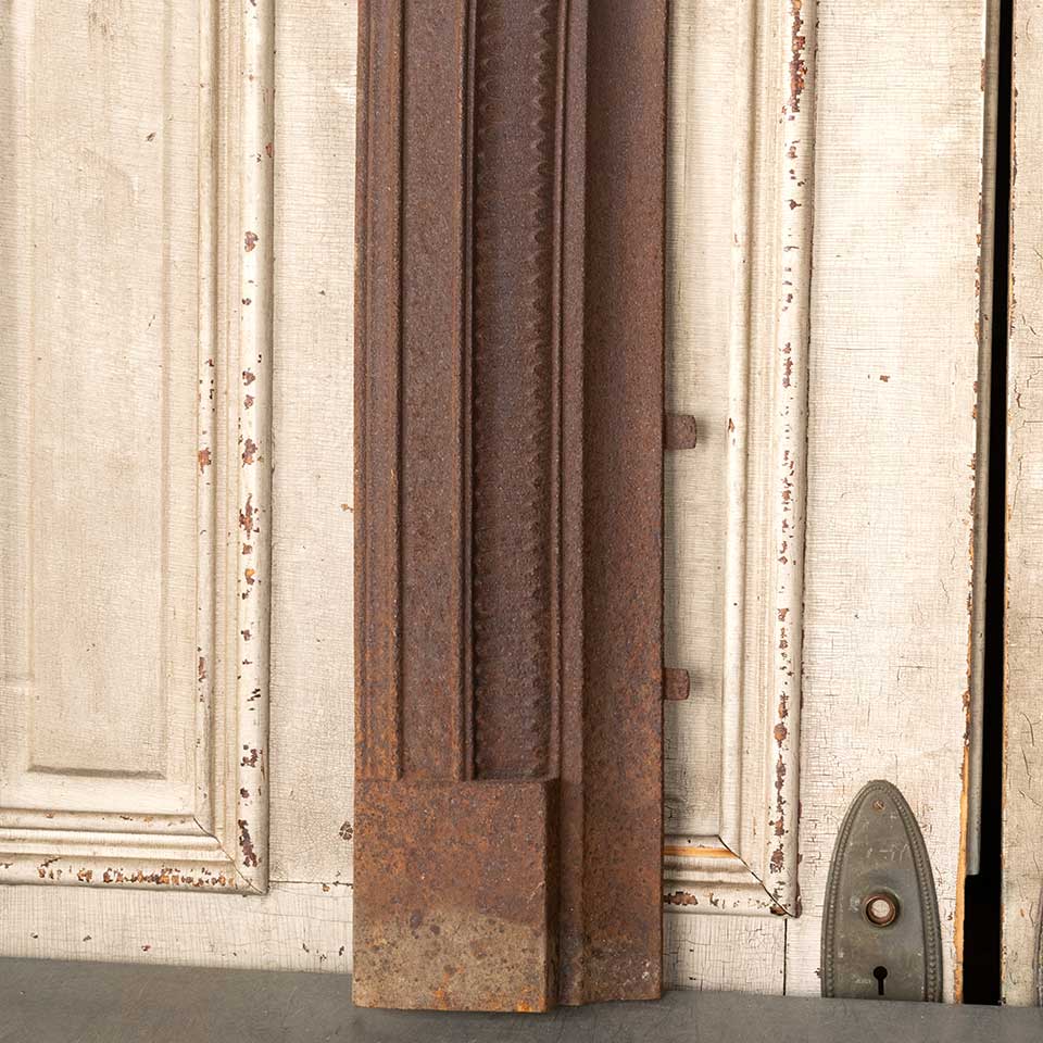 Architectural salvage antique cast iron fireplace surround measuring approx. 32 3/4" wide x 32 3/8" tall x 3" front to back. The interior firebox opening measures approx. 17 1/2" wide x 26 3/4" tall. See photos to evaluate condition.