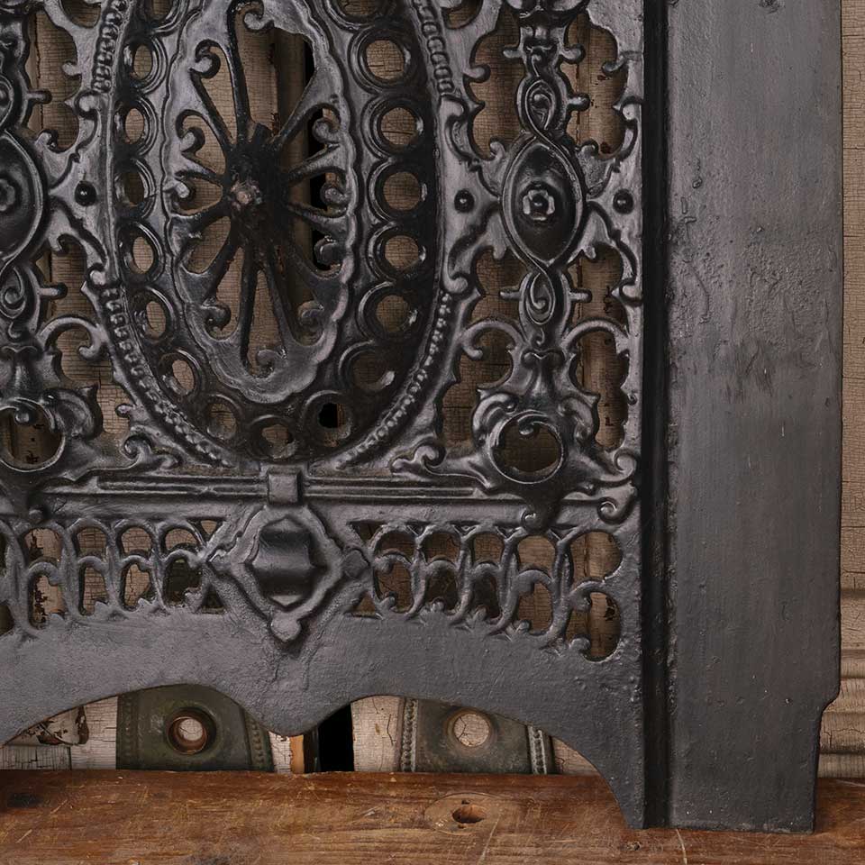 Architectural salvage antique ornate arched top cast iron fireplace summer front cover measuring approx. 19 7/16" wide x 26 1/2" tall x 2" front to back. There looks to be a piece missing from the center medallion. See photos to evaluate condition.