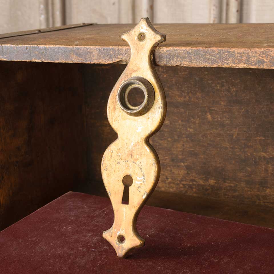Architectural salvage antique brass doorknob backplate hardware measuring approx. 1 3/4" wide x 6 1/2" tall with a 3/4" collar. Spindle and keyholes measure 2 1/2" on centers. Color and condition vary, see photos to evaluate. Priced at $20/each.