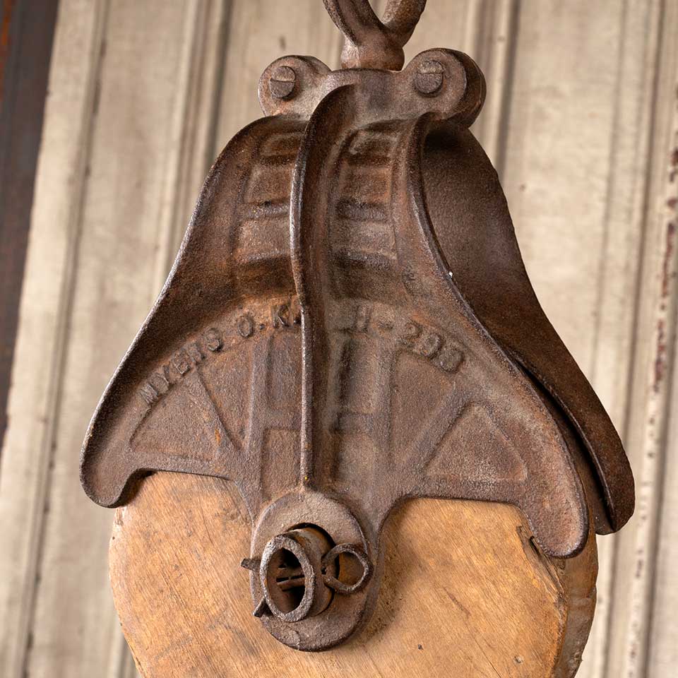 Architectural salvage antique cast iron and wood barn pulley measuring approx. 6 3/8" wide x 11 1/2" tall x 4" front to back. Marked "MYERS O.K. H-288". See photos to evaluate condition.