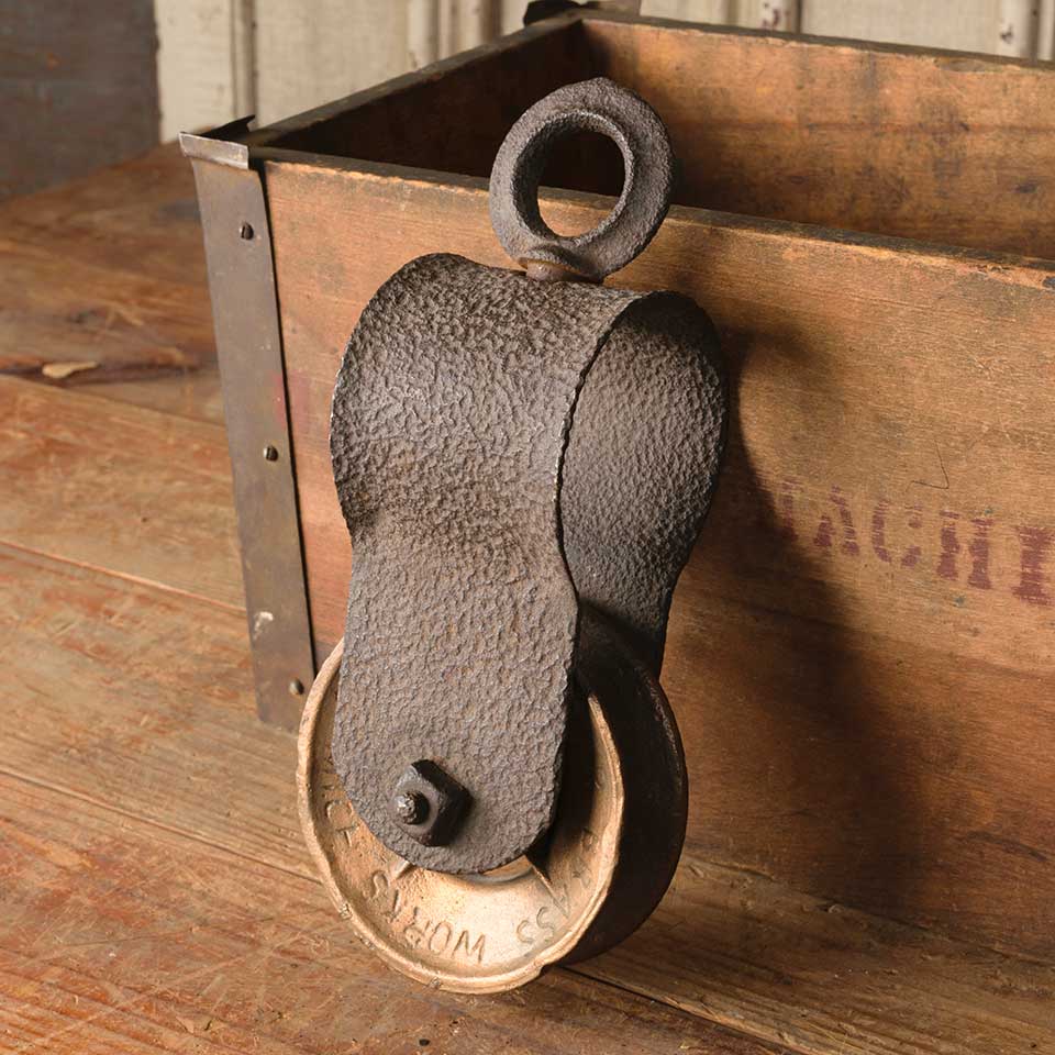 Architectural salvage antique cast iron and brass barn pulley measuring approx. 4 3/8" wide x 9 3/4" tall x 3 3/8" front to back. The wheel is marked: "STAR BRASS WORKS KALAMAZOO MICH PAT. PEN'D". See photos to evaluate condition.