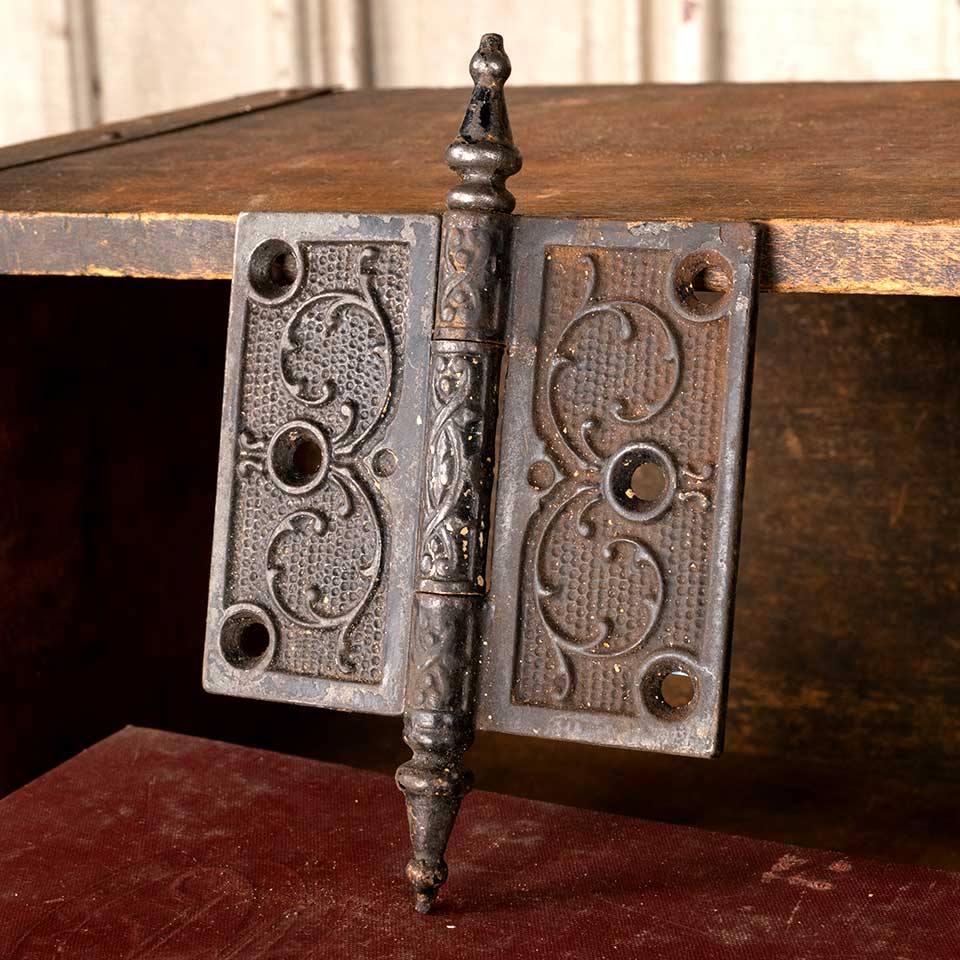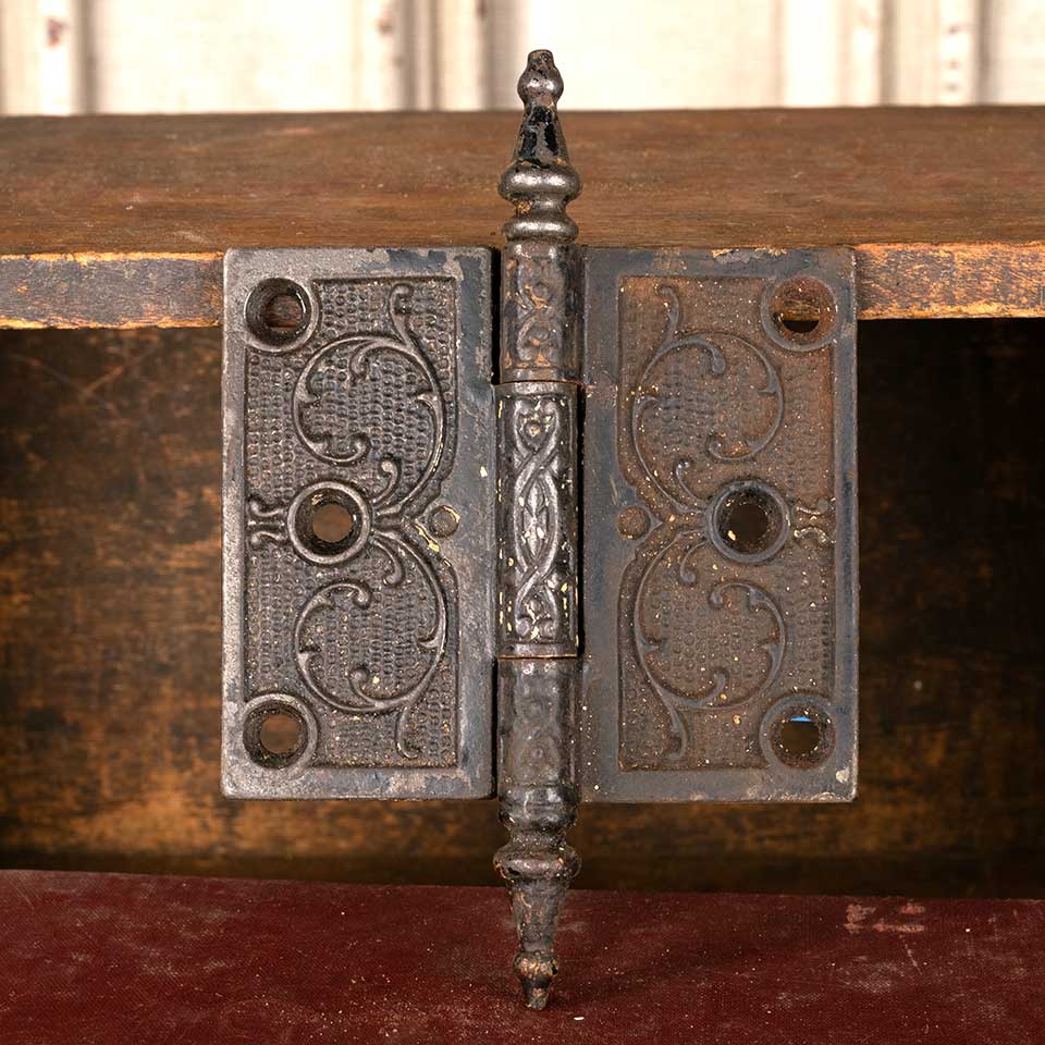 Architectural salvage antique ornate cast iron door hinge hardware with steeple finials measuring approx. 4" wide x 3 1/2" tall (6" tall including finials). See photos to evaluate condition.