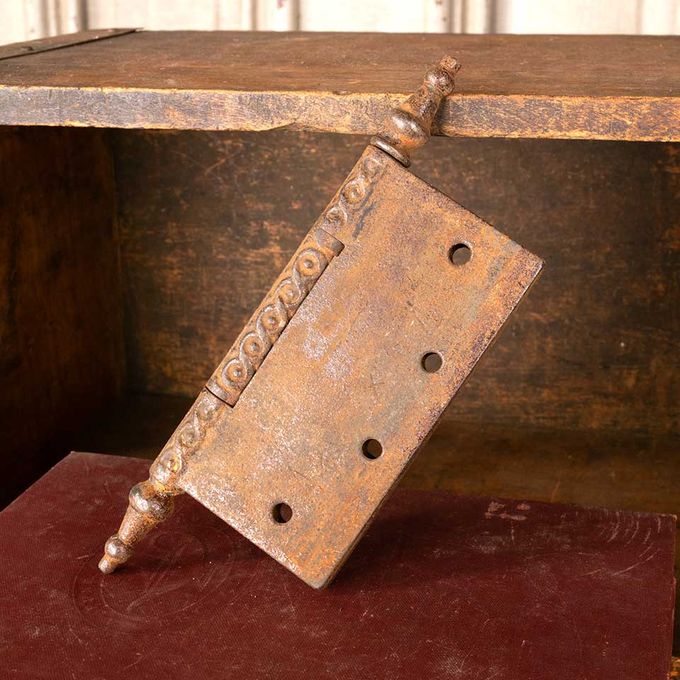 Architectural salvage antique ornate cast iron door hinge hardware with steeple finials measuring approx. 4 1/2" square (7 1/4" tall including finials). See photos to evaluate condition.