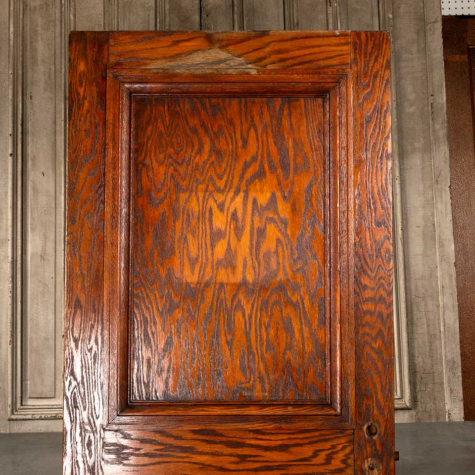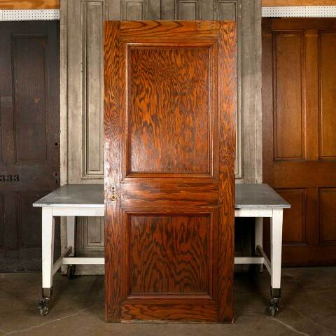 Architectural salvage antique interior two panel oak door with mortise lock measuring approx. 35 3/4" wide x 82 7/8" tall x 1 3/4" thick. There's some veneer damage along the bottom. See photos to evaluate condition.