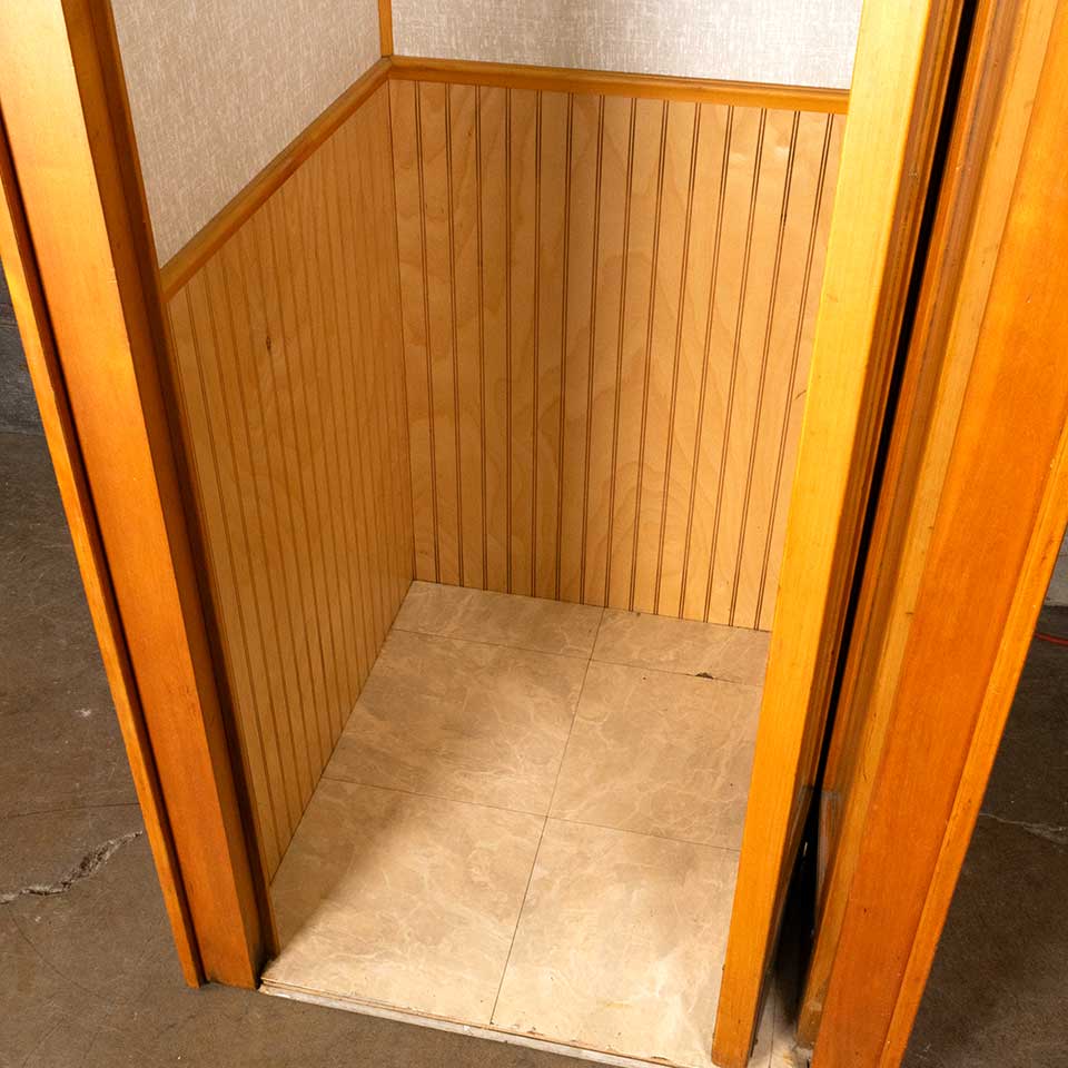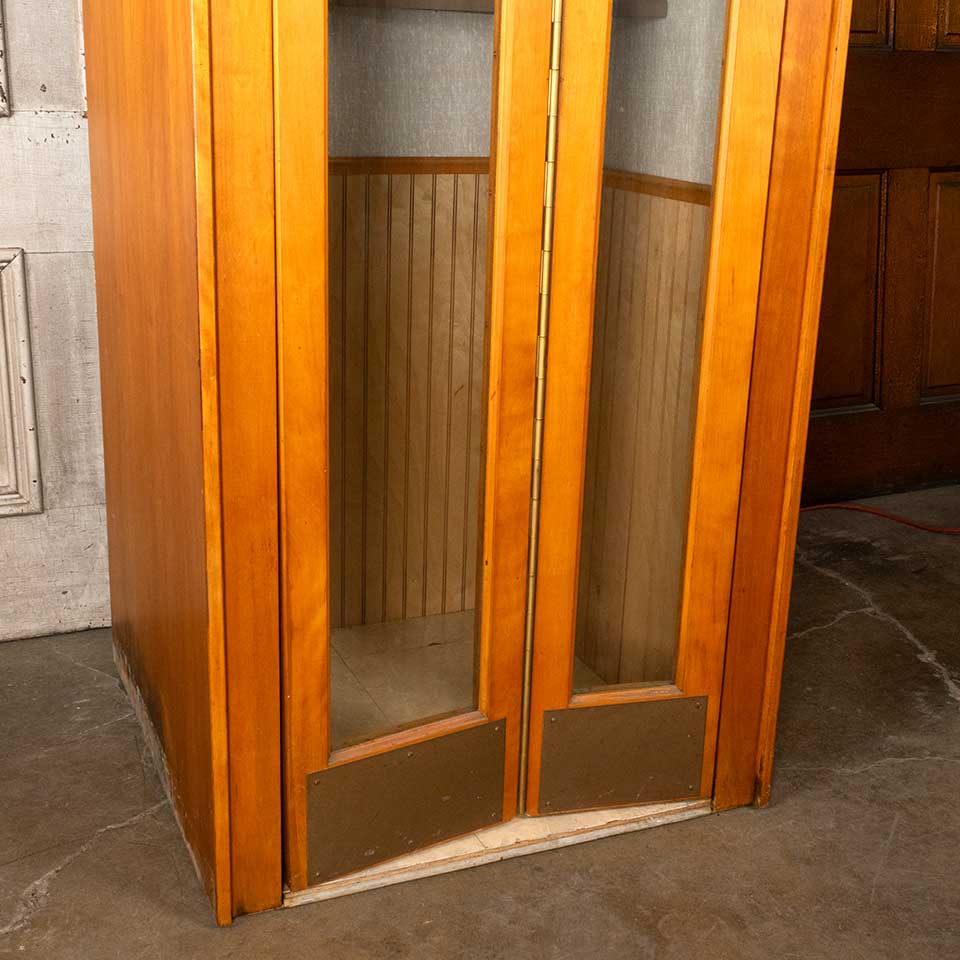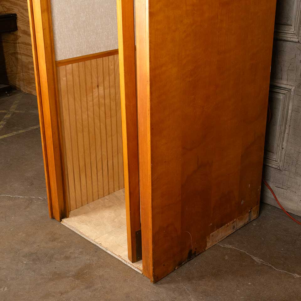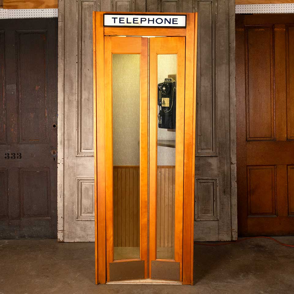 Architectural salvage antique wood public coin operated TELEPHONE booth with operable light measuring approx. 30 1/2" wide x 83 1/4" tall x 30 1/2" front to back. The fan is wired, but not currently working. See photos to evaluate condition.