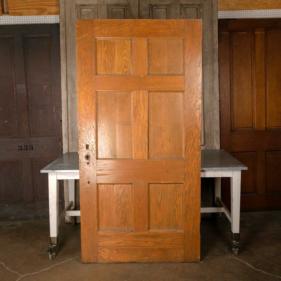 Architectural salvage antique oak six panel entry door with mortise lock measuring approx. 41 5/8" wide x 83 1/4" tall x 1 3/4" thick. all of the panels have a vertical split and there's missing and loose veneer at the bottom. See photos to evaluate condition.
