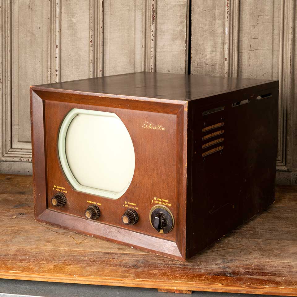 Antique wood cased Silvertone television set measuring approx. 18 7/8" wide x 14 1/2" tall x 20 3/16" front to back. See photos to evaluate condition.
